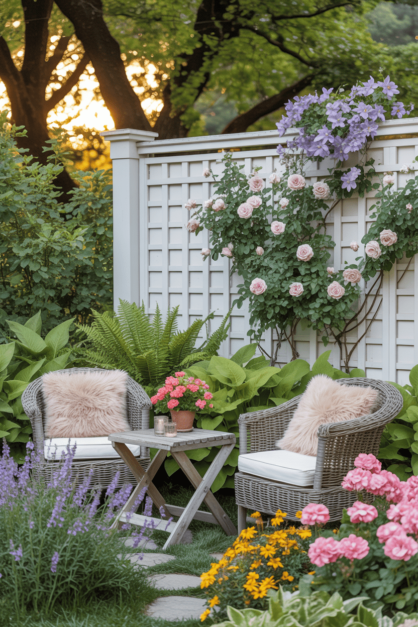 A lattice privacy wall offers partial coverage while still feeling airy and light. The open grid pattern is perfect for supporting climbing plants. Over time, vines can grow across the lattice to create a living privacy wall that looks incredibly charming. This type of privacy patio wall works beautifully in cottage-style gardens.
