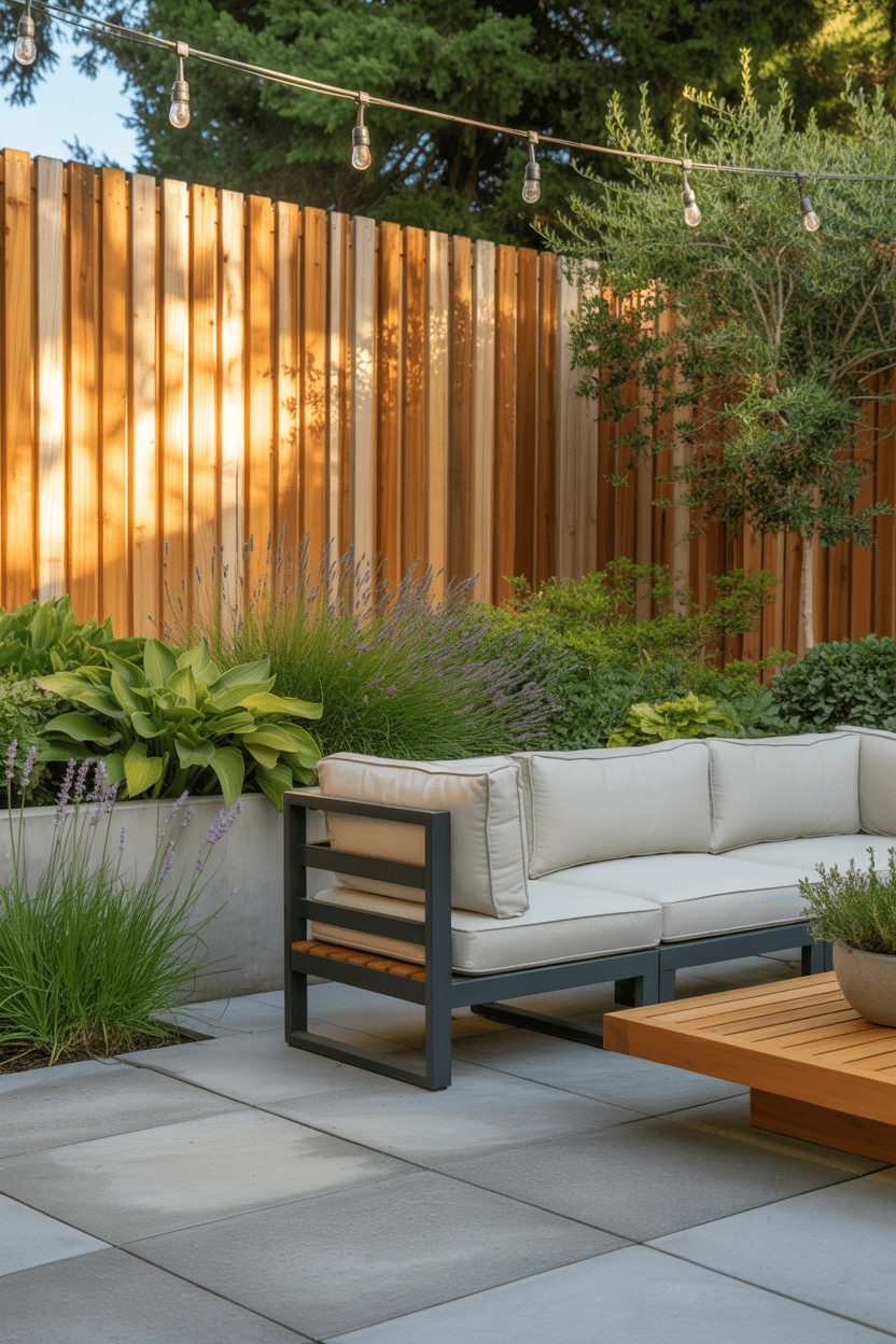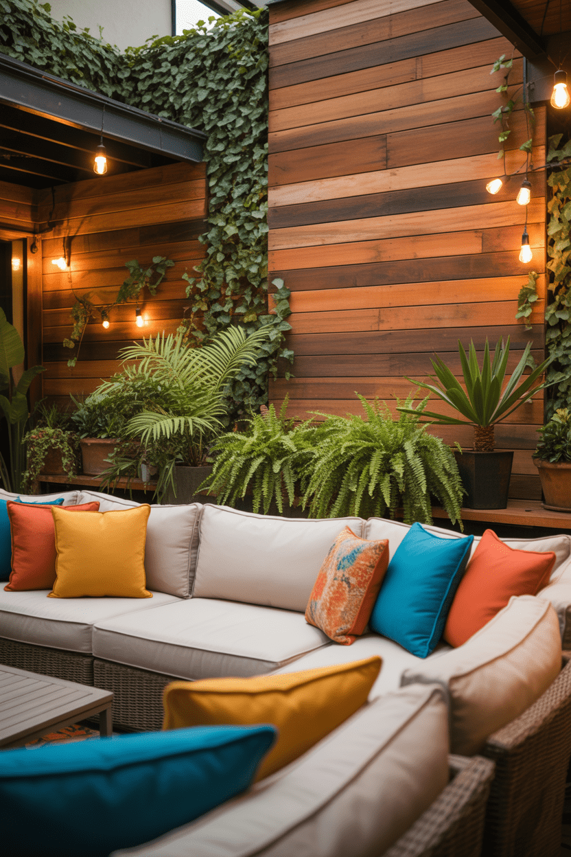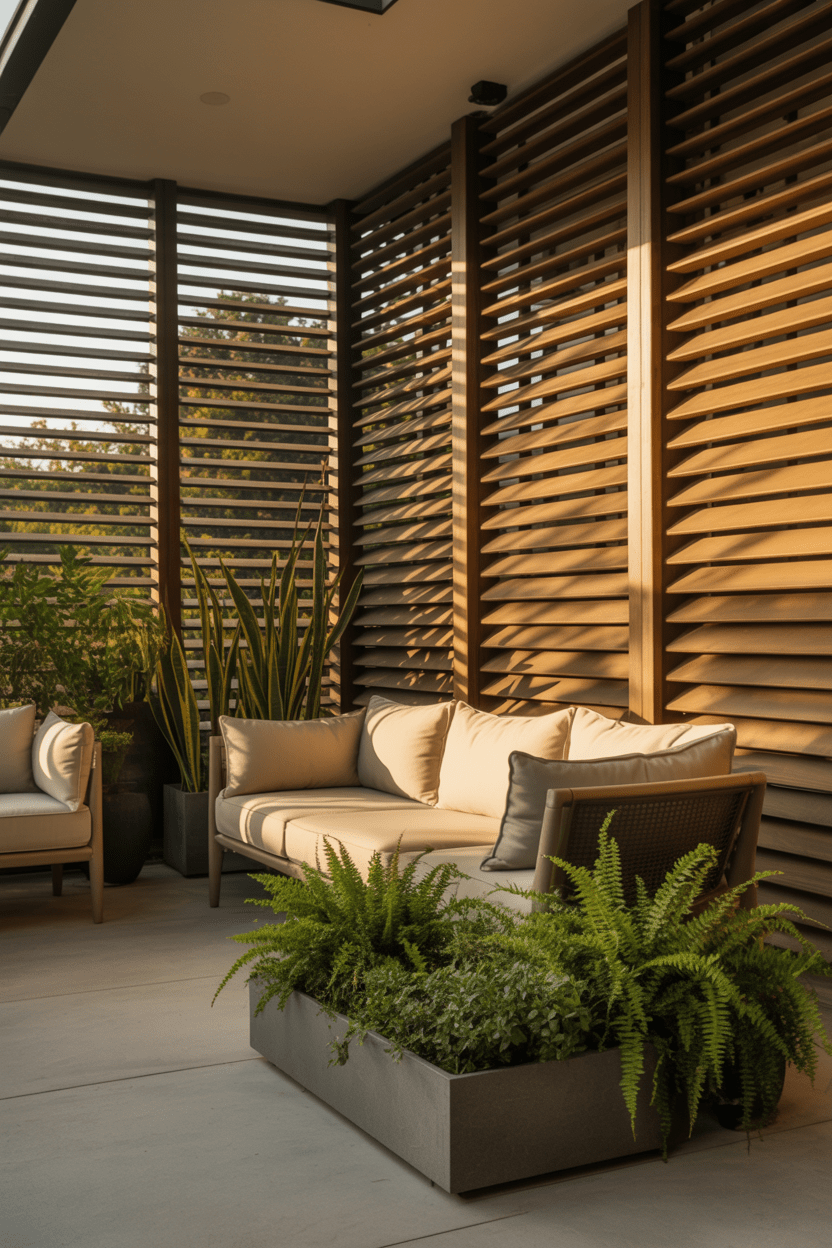 Adding a privacy wall to a covered patio instantly makes the space feel more like an outdoor room. This setup provides shelter, shade, and seclusion all at once. A wood or slatted patio privacy wall pairs beautifully with outdoor sofas and lounge seating.