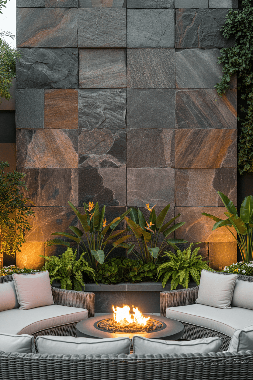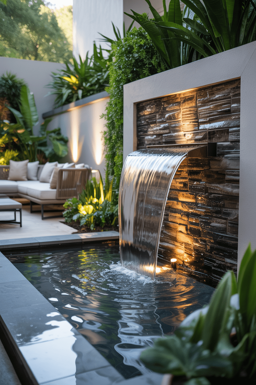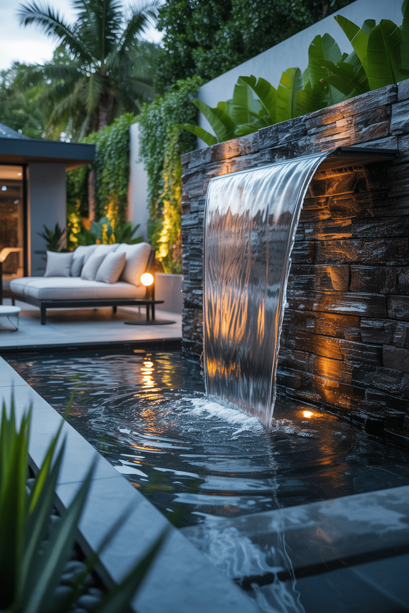 A waterfall privacy wall combines sound, movement, and visual beauty. Water flows down the surface of the wall, creating a soothing backdrop while also providing privacy. This type of backyard privacy wall feels incredibly luxurious and spa-like.