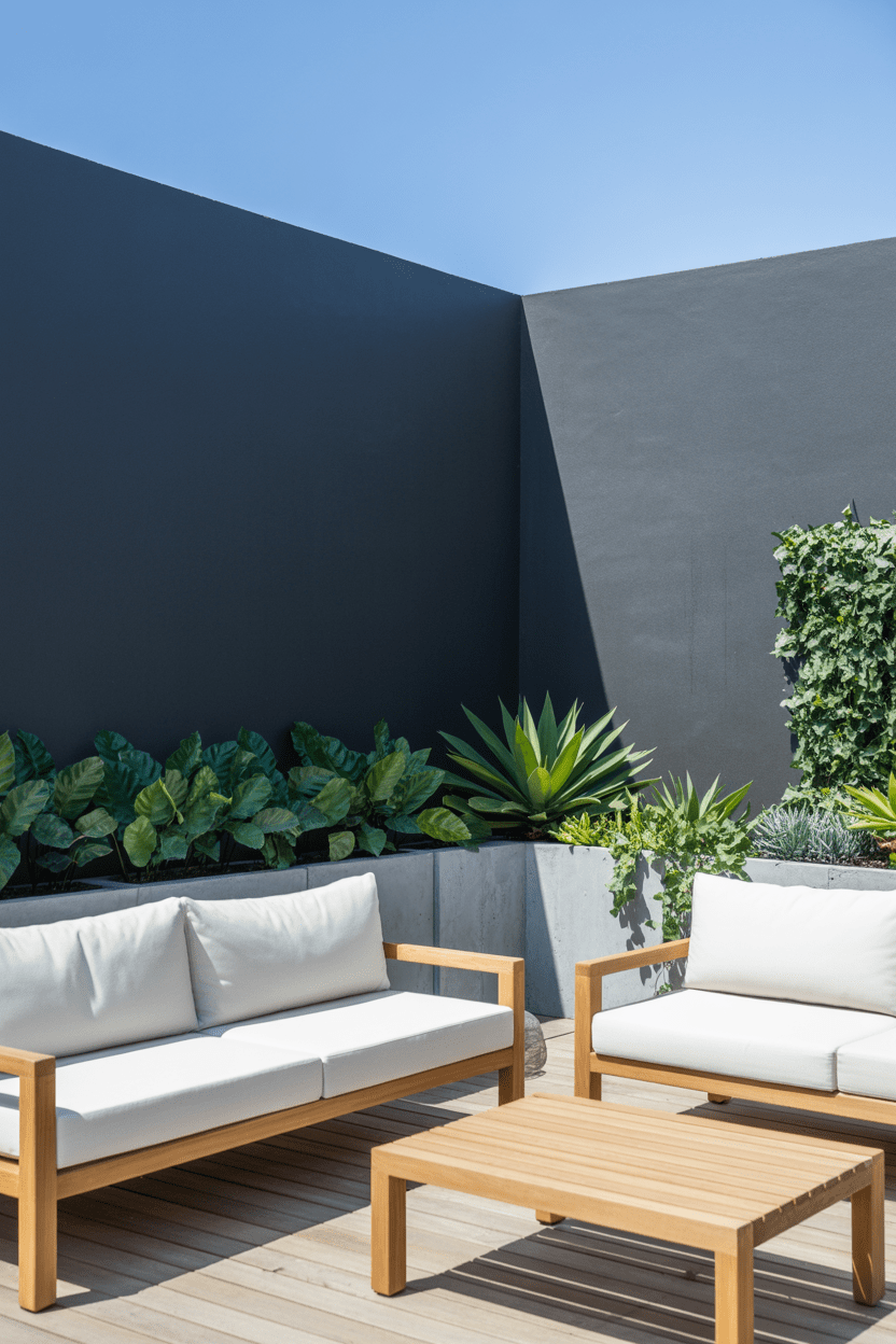 Painting a privacy wall black can create an incredibly dramatic and modern look. A black privacy wall works beautifully with wood decks, greenery, and minimalist outdoor furniture. The dark color makes plants and decor pop, which adds visual depth to the backyard.