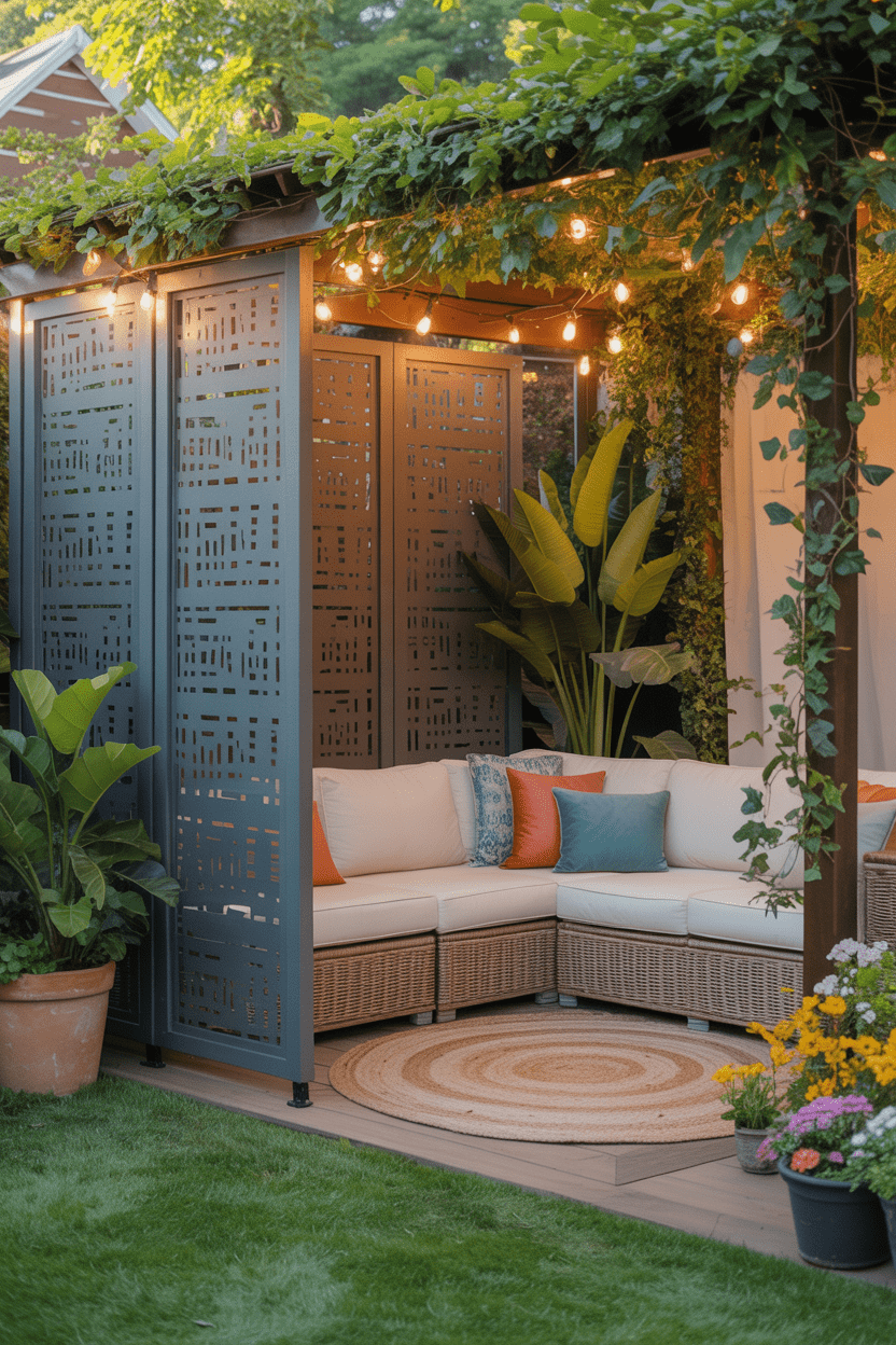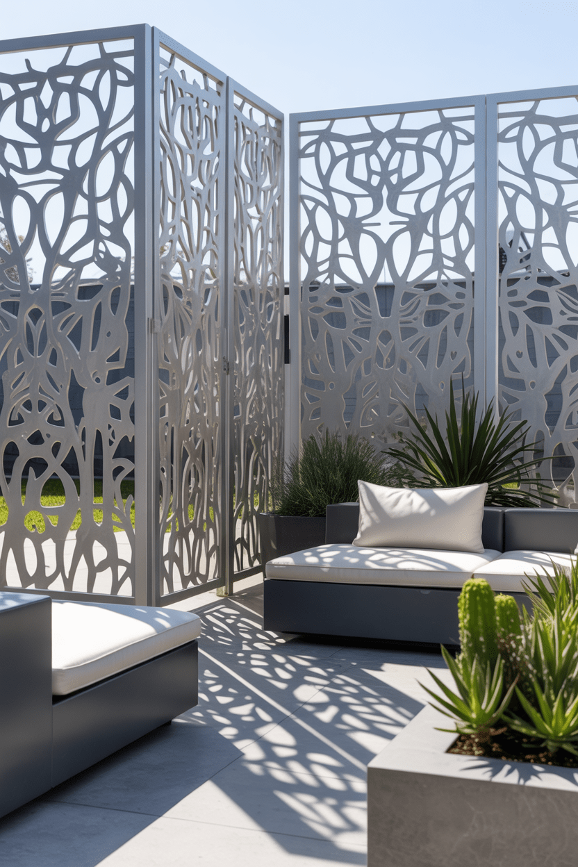 Decorative metal panels with laser-cut patterns can create a truly eye-catching privacy wall. These panels allow light to pass through while still blocking direct views. A metal privacy wall adds a contemporary architectural feel to the backyard.
