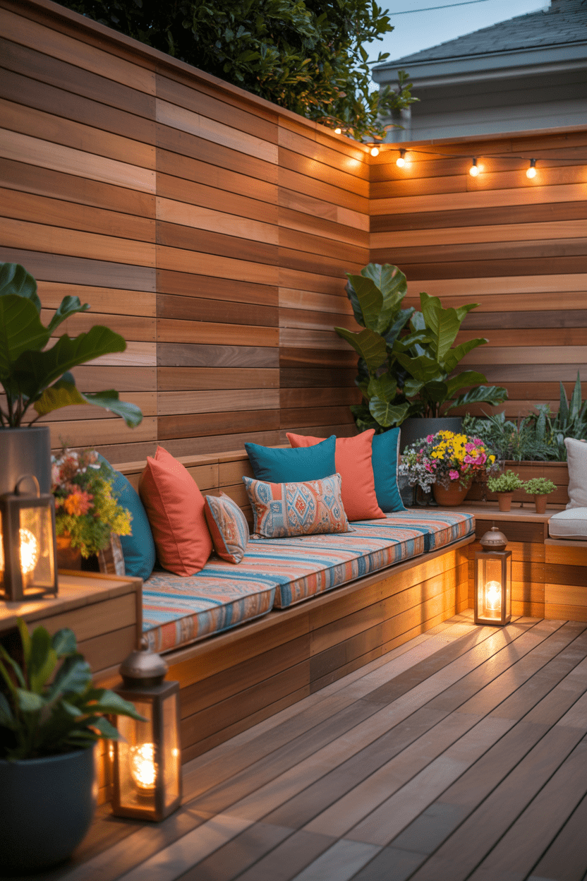 Combining seating with a privacy wall is a smart way to maximize functionality in smaller backyards. A built-in bench attached to a deck privacy wall creates a comfortable seating area while blocking unwanted views. It’s practical and stylish at the same time.