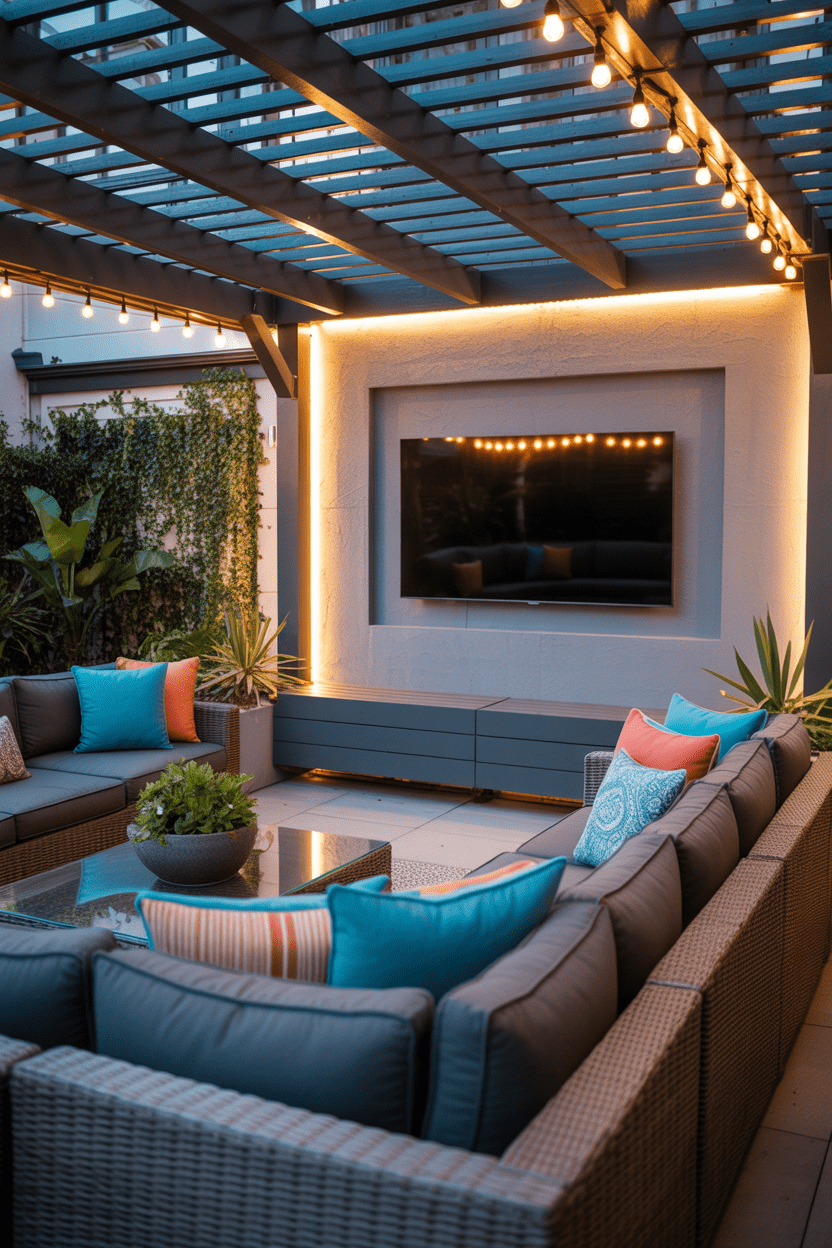 If your patio doubles as an outdoor entertainment zone, a privacy wall with an outdoor TV is a fantastic upgrade. The privacy wall acts as a backdrop and mounting surface for the television. This setup works especially well for covered patios or deck lounge areas.