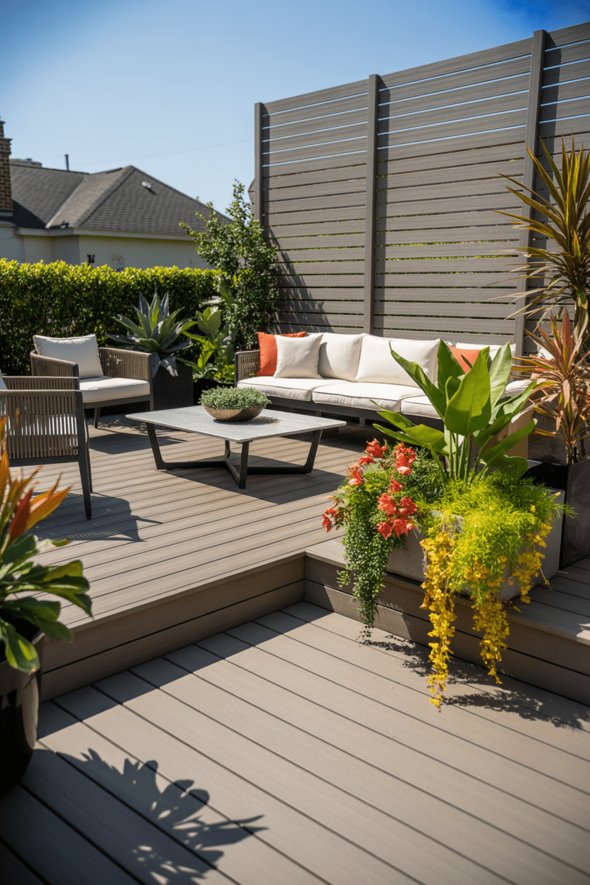 A composite privacy wall is perfect if you want something durable and easy to maintain. Composite materials resist weather, fading, and moisture. This type of deck privacy wall pairs especially well with composite decking for a cohesive look.
