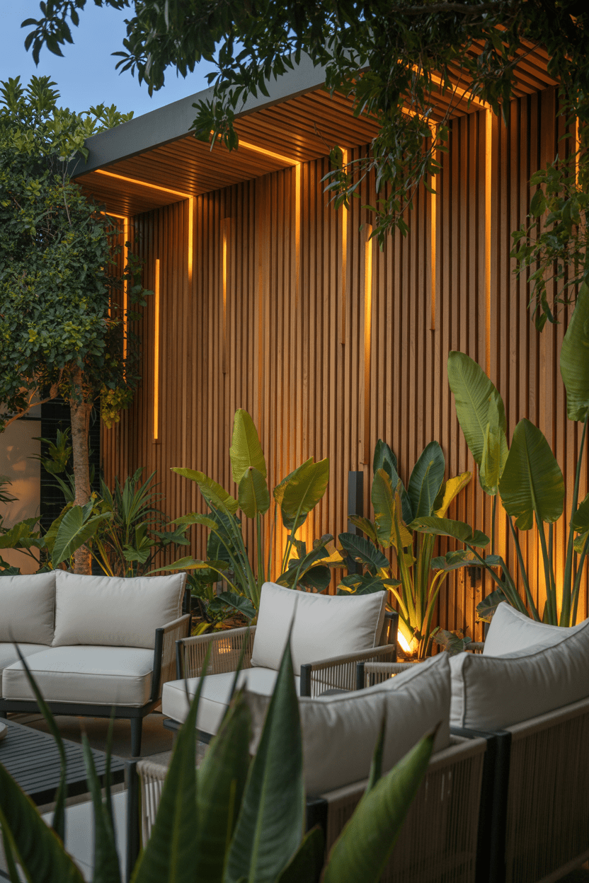 22. Outdoor slatted privacy wall with built-in lighting