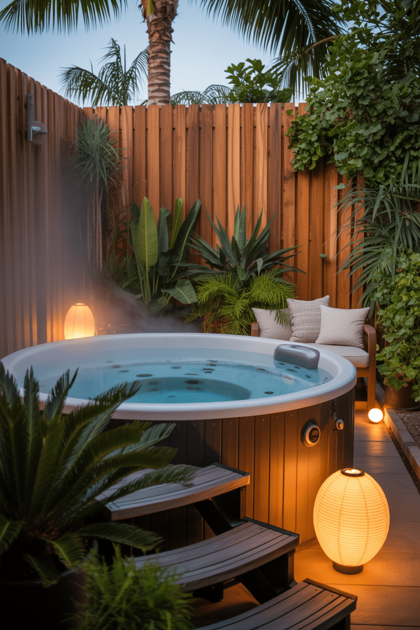 A hot tub privacy wall is practically essential if you want to relax without worrying about who might be looking over the fence. It helps transform your hot tub area into a private backyard spa. A tall wood privacy wall or slatted screen works beautifully around a hot tub. You can soften the look with outdoor lighting, climbing plants, or hanging lanterns to create a cozy retreat vibe.