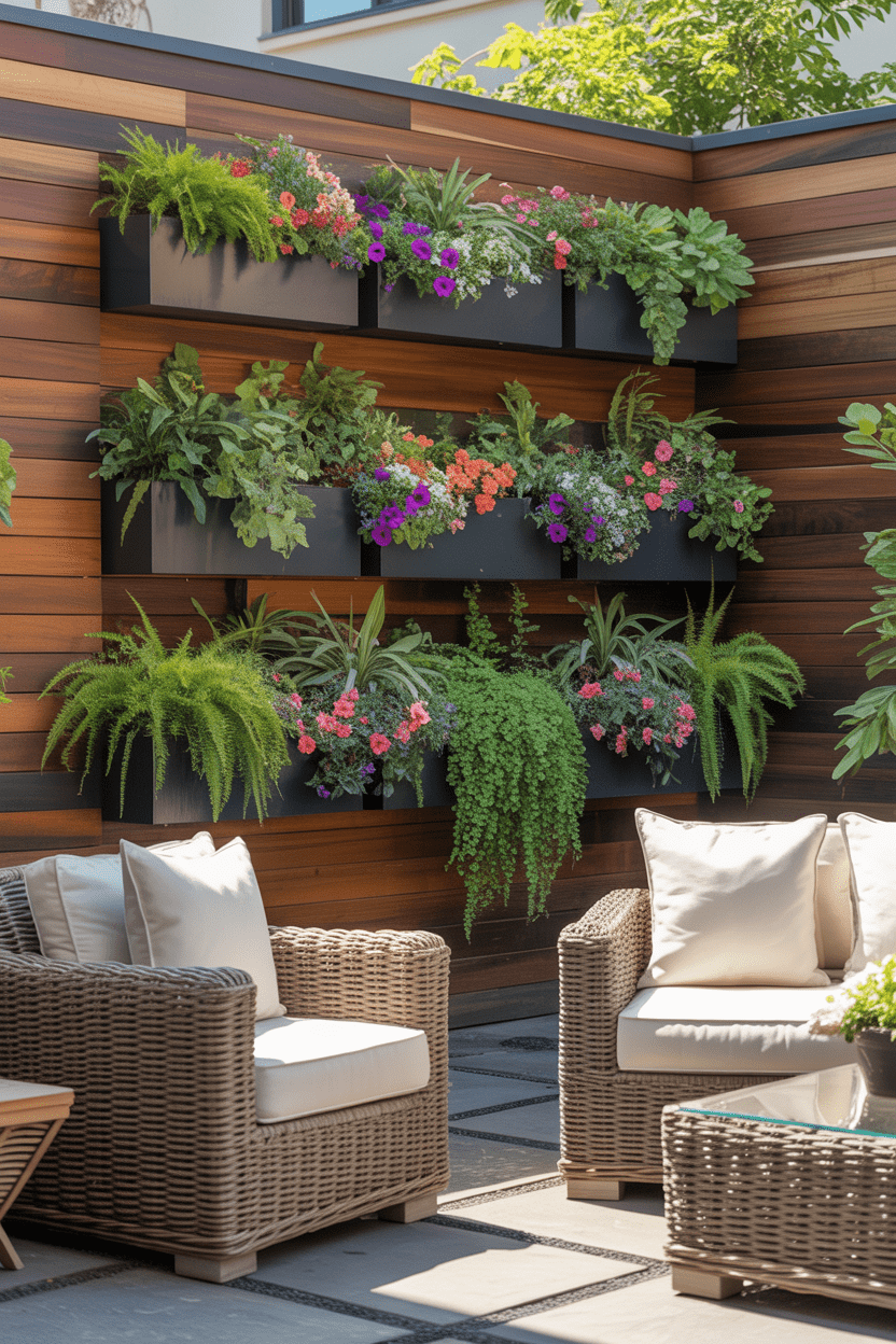 - Use climbing plants or hanging planters to soften a solid privacy wall