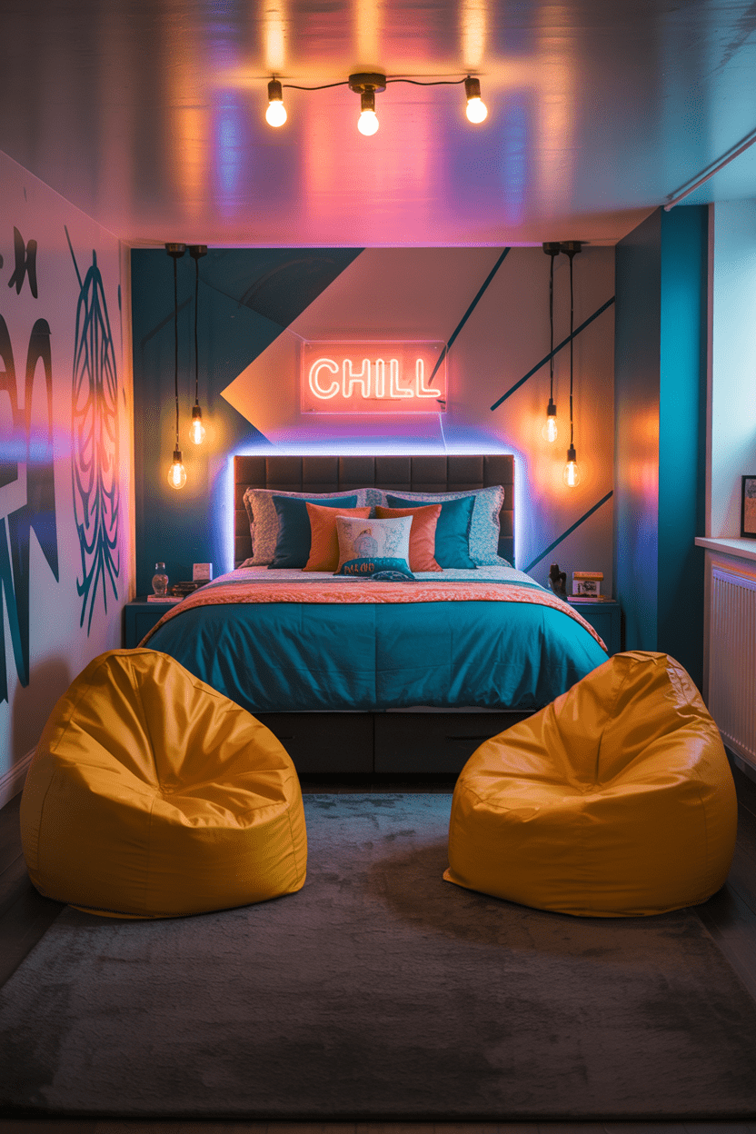 Basements make the ultimate teen space. Think LED lighting, bold colors, and comfy seating alongside the bed. This type of teenage basement bedroom idea feels like a mix of a bedroom and hangout zone.