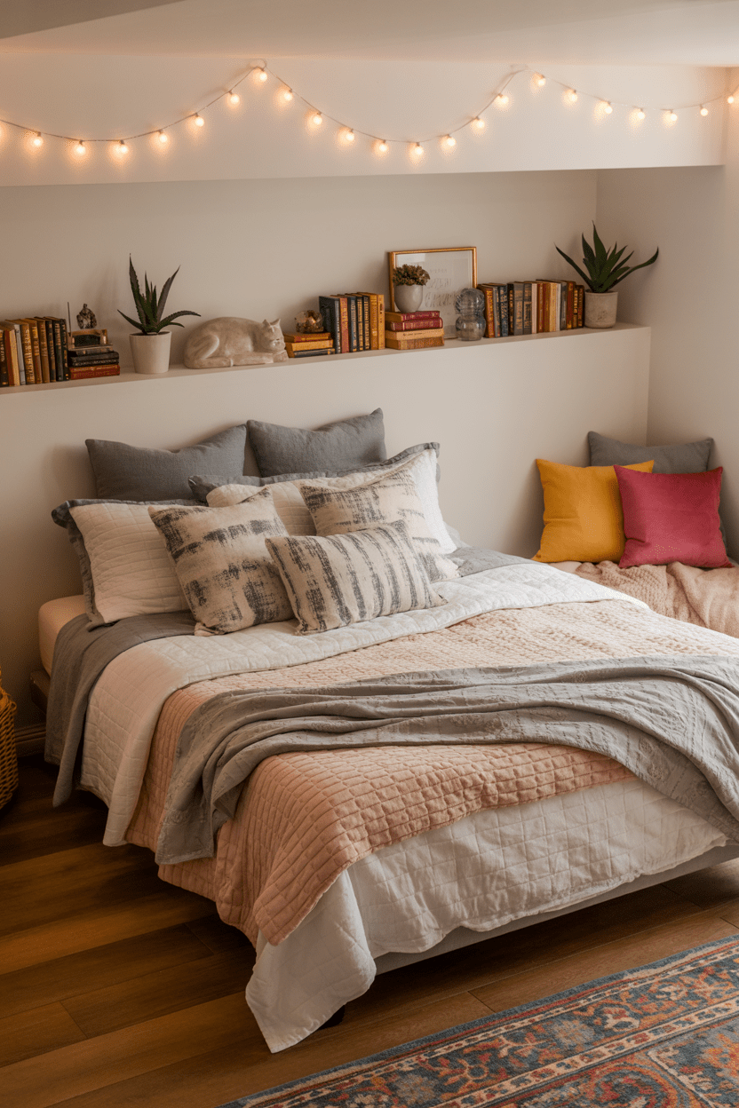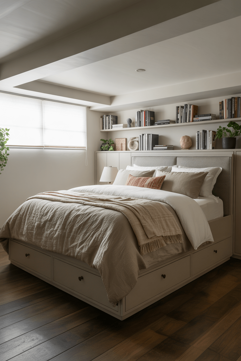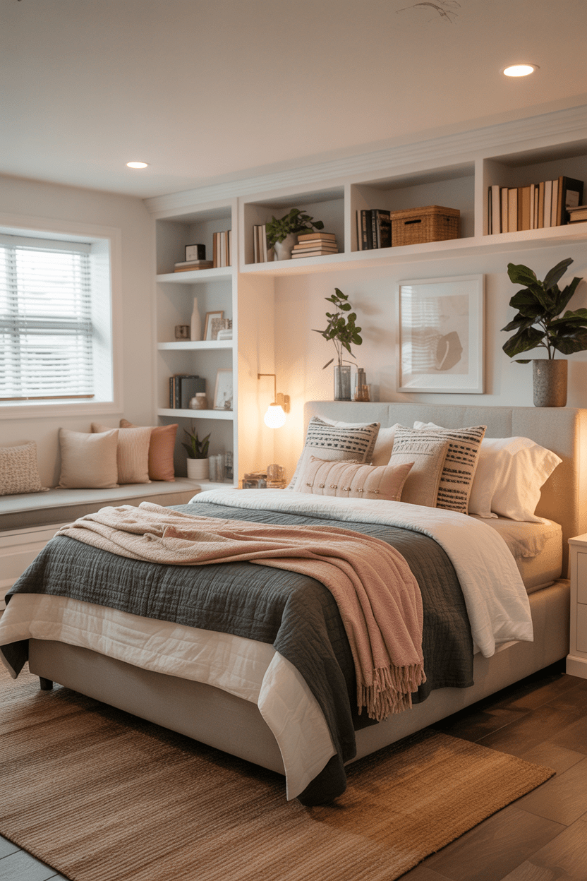 Built-in shelving and seating are one of my favorite ways to finish a basement bedroom. They maximize storage while giving the space a polished look that feels custom-made.