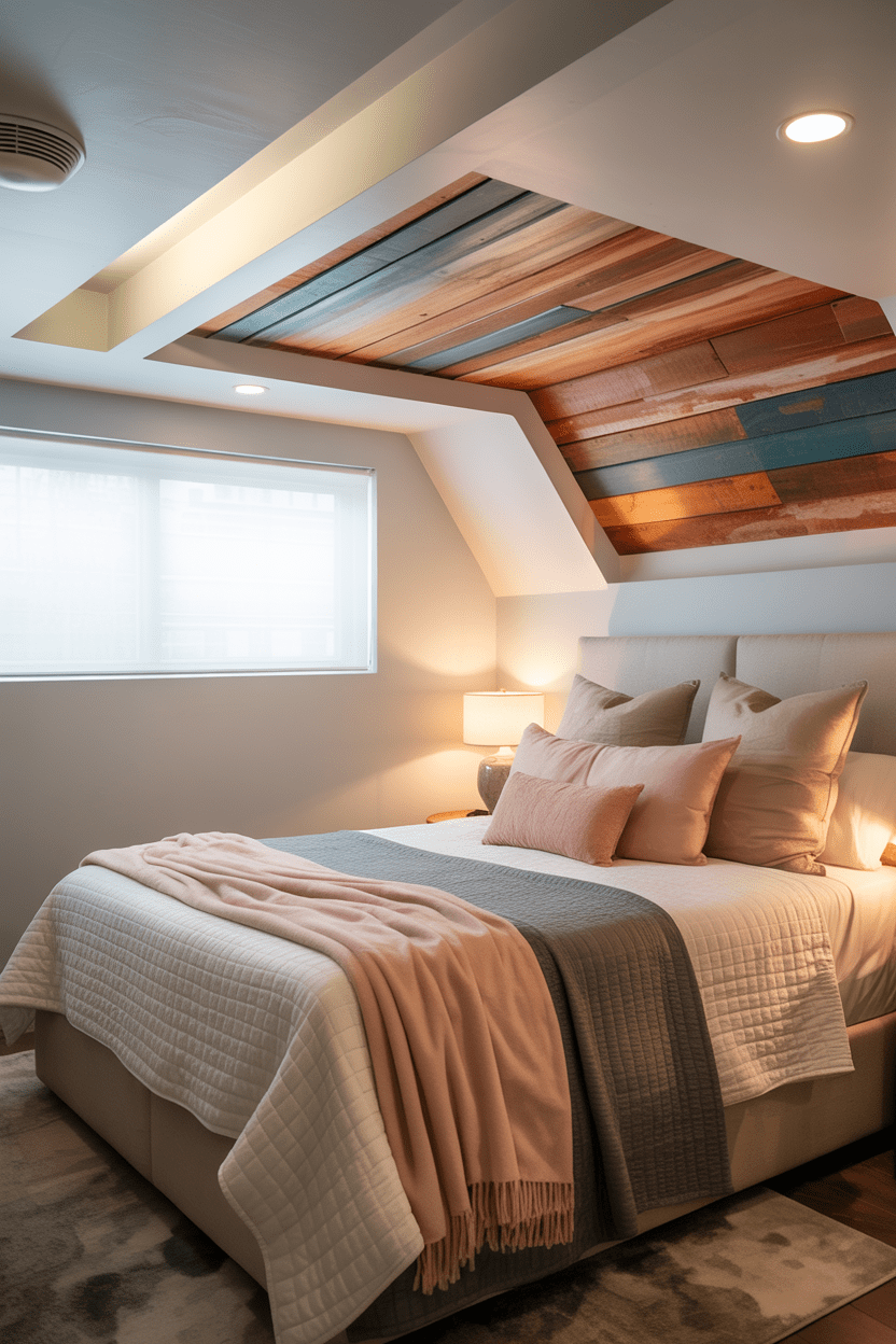 Since basements don’t always have high ceilings, I like to draw attention upward with paint, wood planks, or even patterned wallpaper. This basement bedroom ceiling idea adds visual interest instantly.