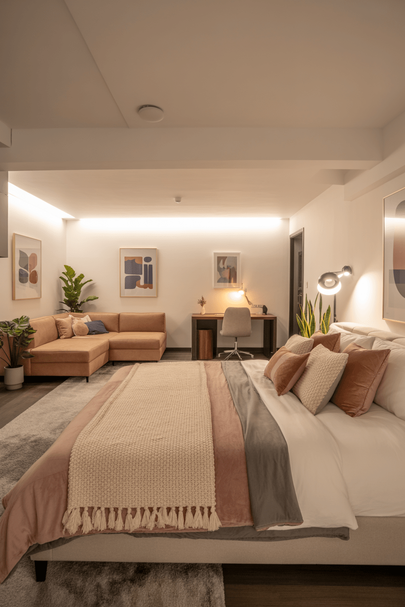 For larger basements, an open-concept bedroom works beautifully. Blend the sleeping space with a lounge area or home office. It’s a flexible basement bedroom layout idea that makes the most of every inch.