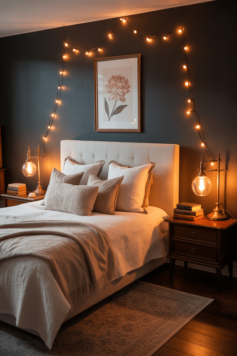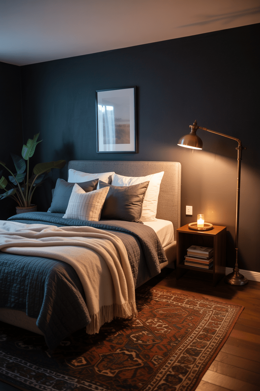 If you want a cozy, cocoon-like space, lean into moody, dark colors. Deep charcoals, navy blues, and layered fabrics turn a basement bedroom into a moody retreat that feels restful and stylish.