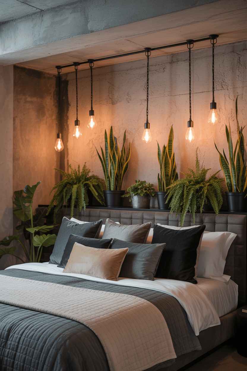I’ve always been drawn to industrial spaces with exposed concrete, metal light fixtures, and dark tones. This basement bedroom idea works especially well if you lean into unfinished textures and pair them with sleek, modern furniture.
