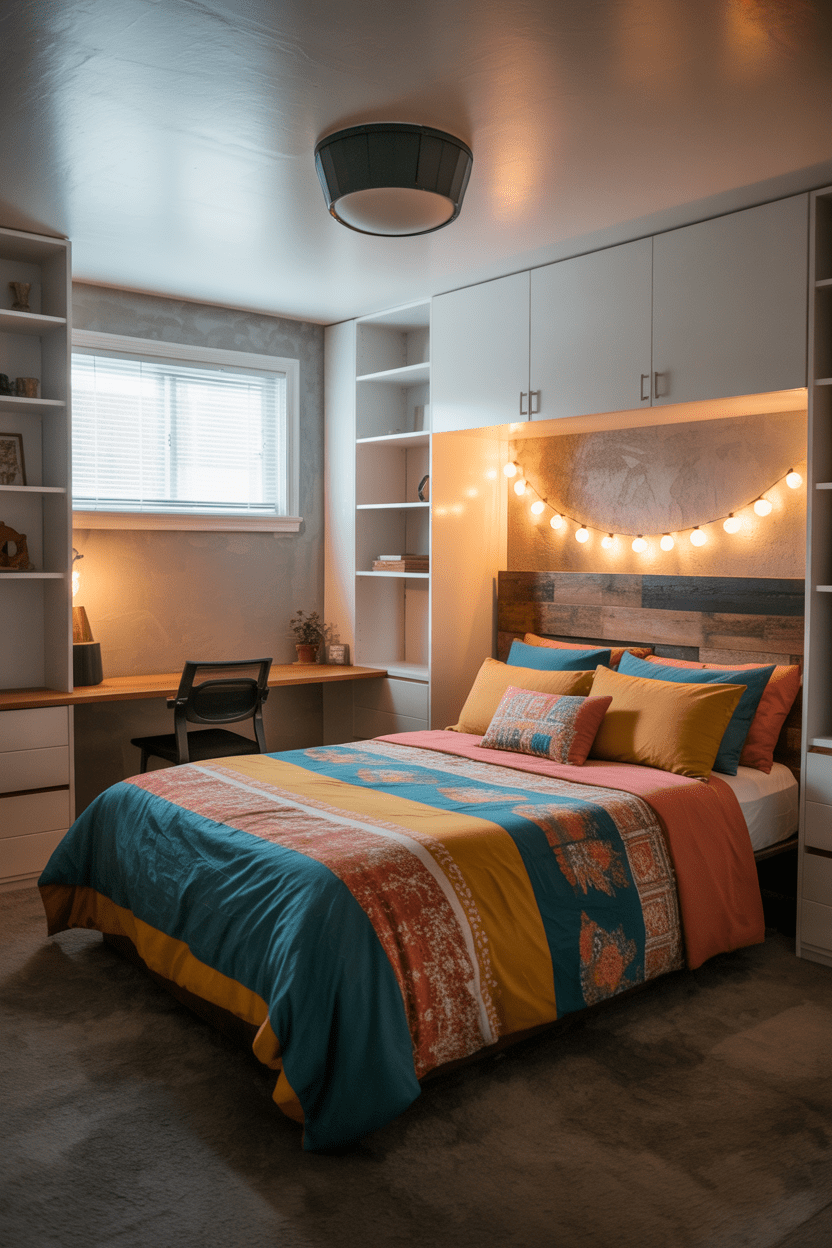 If your basement doesn’t have much square footage, clever storage is key. Built-in closets, under-bed drawers, and hidden shelving make your basement bedroom functional without feeling cluttered.