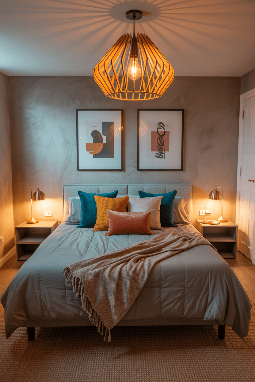 8. Basement guest bedroom with statement lighting
