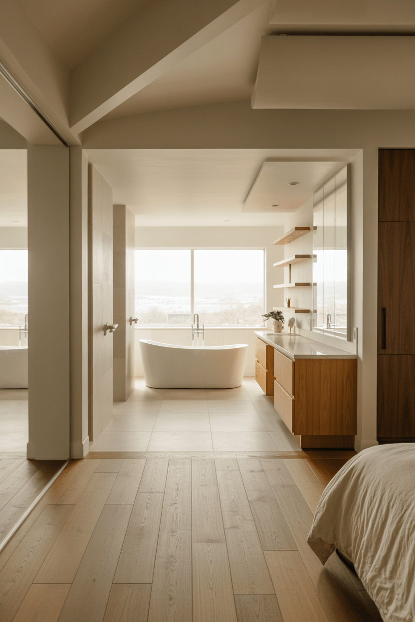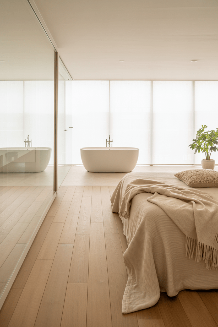 Open concept en suite bathroom ideas are for anyone who wants their bedroom and bath to feel like one cohesive sanctuary. I love this look because it instantly feels high-end and airy. Matching flooring between the bedroom and en suite, a freestanding tub positioned as a focal point, and minimal visual barriers make the entire space feel expansive. If you want definition without closing things off, a partial glass divider works beautifully.