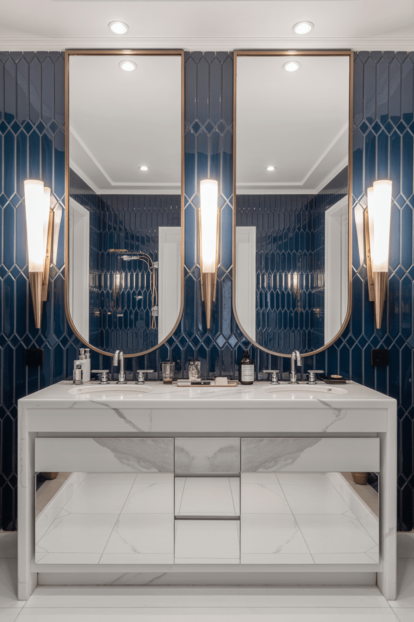 En suite bathroom ideas often center around symmetry, and I am such a fan of that look. A double vanity with statement mirrors and sconces creates instant impact. Adding tile, paneling, or wallpaper behind the vanity makes it feel like a true focal point instead of just a functional necessity.