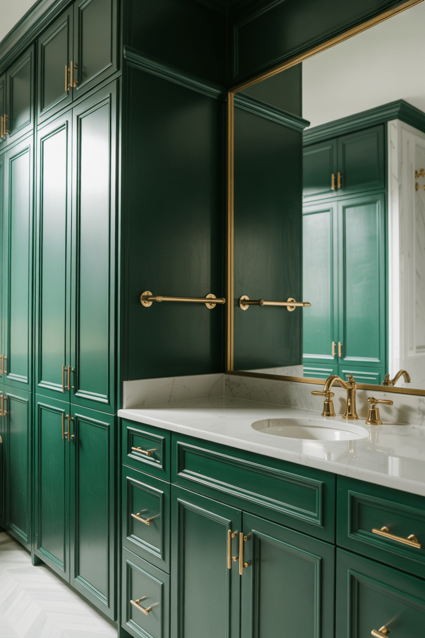 If you’ve ever felt bored by all-white bathrooms, this is your permission slip to go bold. Deep navy, emerald green, terracotta, or even dusty pink cabinetry can transform the entire mood. I love pairing a strong color with simple hardware to keep it feeling elevated instead of overwhelming.