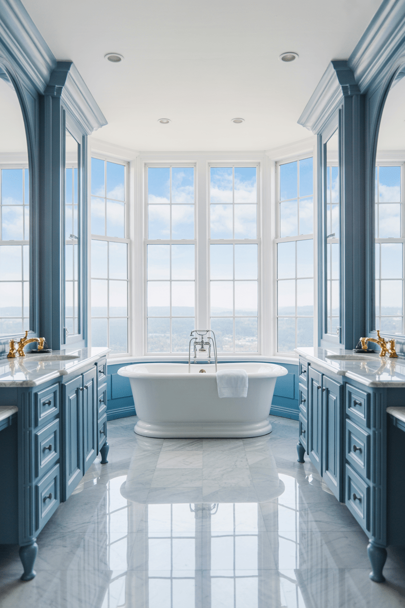 Big bathroom suite layouts that place the tub front and center feel incredibly luxurious. A freestanding tub positioned symmetrically between vanities or windows creates a sense of balance that just feels right. It’s dramatic, but in a refined way.