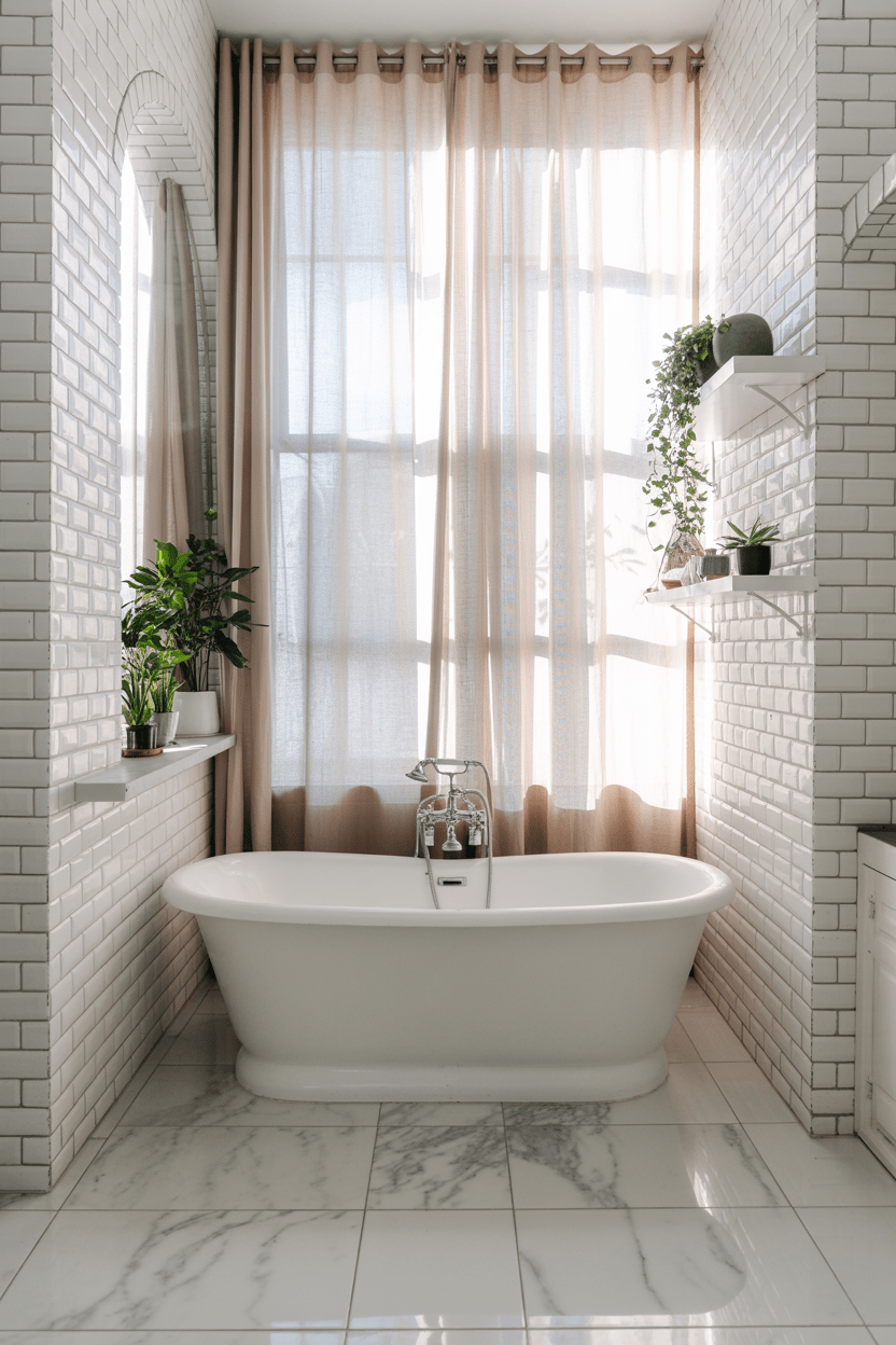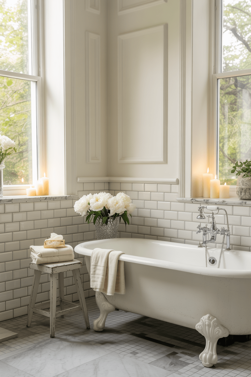 White bathroom ideas will always have a place in my heart. There’s something so calming about crisp white tile, marble accents, and soft natural light. Add a woven stool or greenery to warm it up, and you’ve got that effortless spa vibe.