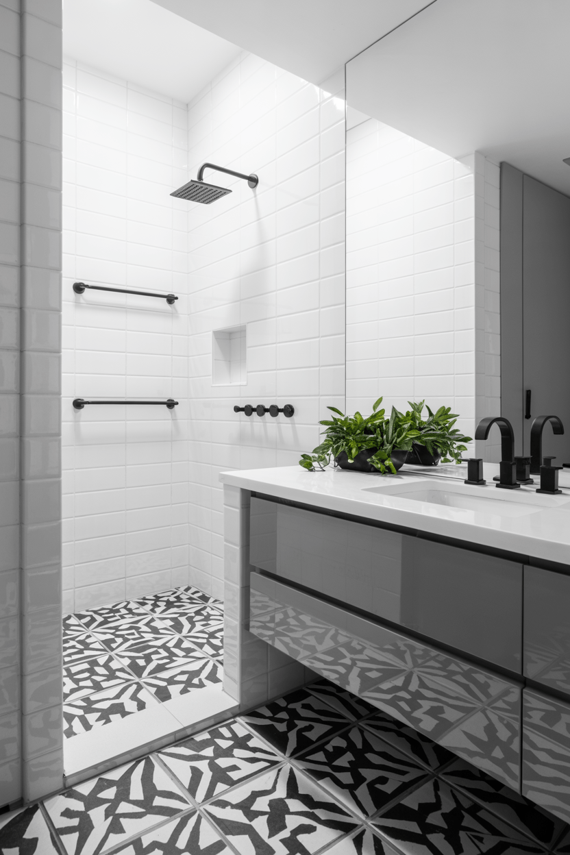 Black bathroom en suite ideas don’t have to mean fully dark walls. I love a high-contrast approach—black fixtures against white tile or graphic flooring. It feels modern, striking, and timeless all at once.