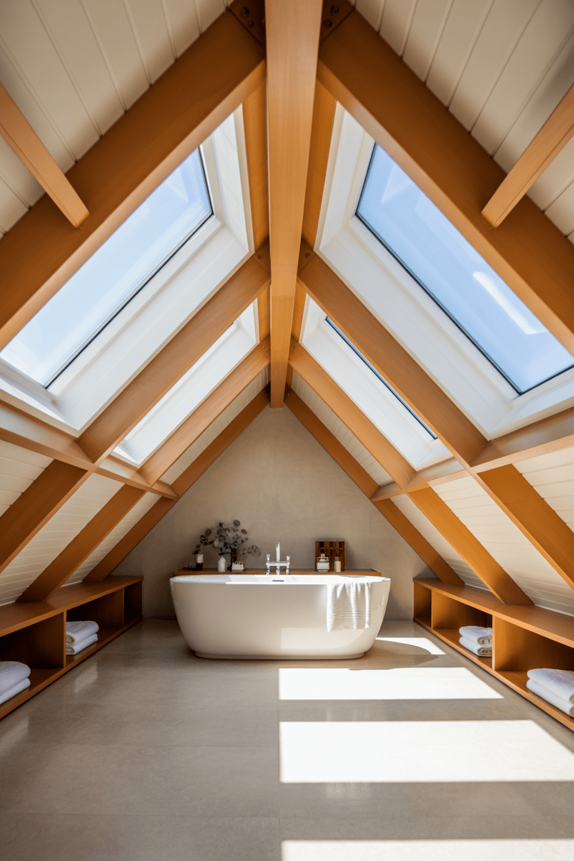 Attic bathrooms with a slanted ceiling layout are full of character. Instead of fighting the angles, lean into them. Install skylights, tuck storage under the eaves, and keep the palette light to highlight the architectural charm.
