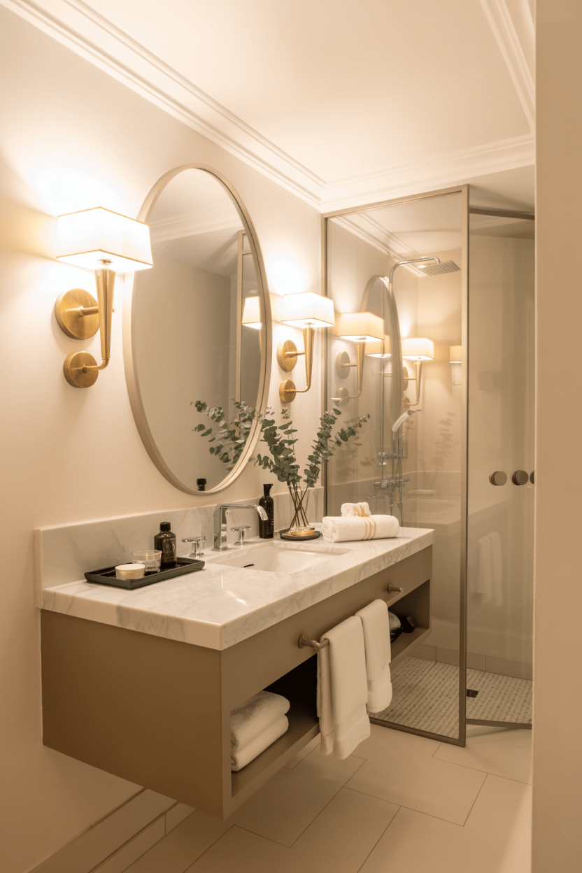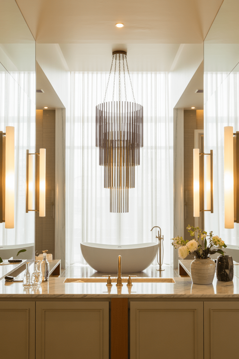The impact of an en suite bathroom design often comes down to lighting. A sculptural chandelier or dramatic sconces can completely shift the mood of the room. I always recommend layering lighting so your en suite feels cozy at night and bright in the morning.
