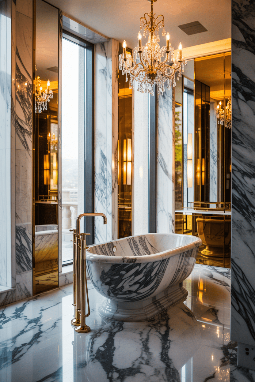 When I think of luxury bathrooms, I picture a sculptural soaking tub stealing the show. A freestanding tub under a window or beneath a chandelier creates that five-star hotel energy we all secretly want. Layer in marble tile, warm metallic fixtures, and soft lighting, and suddenly your everyday bath feels like a ritual instead of a routine.