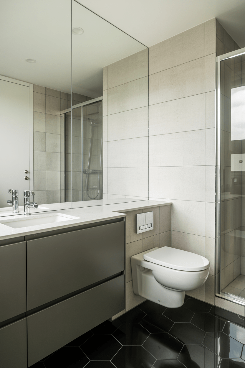 Small en suite bathrooms benefit from visual lightness and contrast. Floating vanities, wall-mounted fixtures, and large-format tile make the room feel more open. Even in tight spaces, smart design choices go a long way.