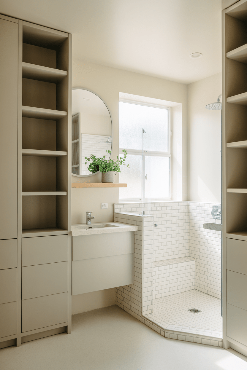 If you have a tiny en suite bathroom, then focus on maximizing vertical space. Tall cabinets, recessed niches, and oversized mirrors create the illusion of height. Keeping the palette light helps prevent the space from feeling cramped.