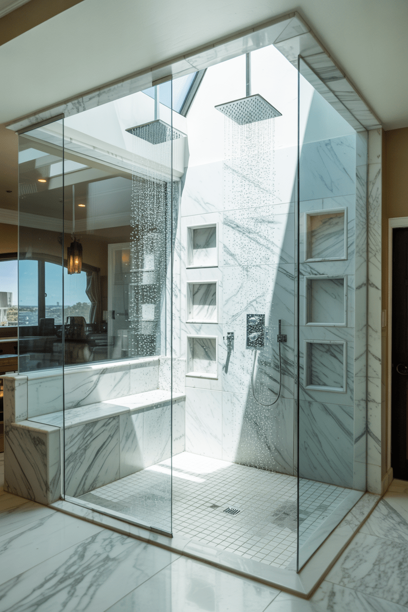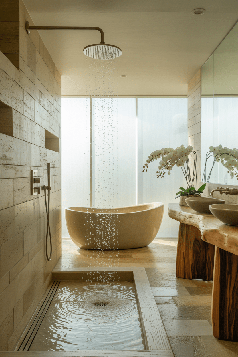 Large bathrooms really shine when you embrace a spa-inspired wet room. Seamless tile from floor to shower, linear drains, and oversized stone instantly feel modern and calming. If you have the space, letting the shower flow openly without bulky enclosures gives that effortless designer look I’m always drawn to.