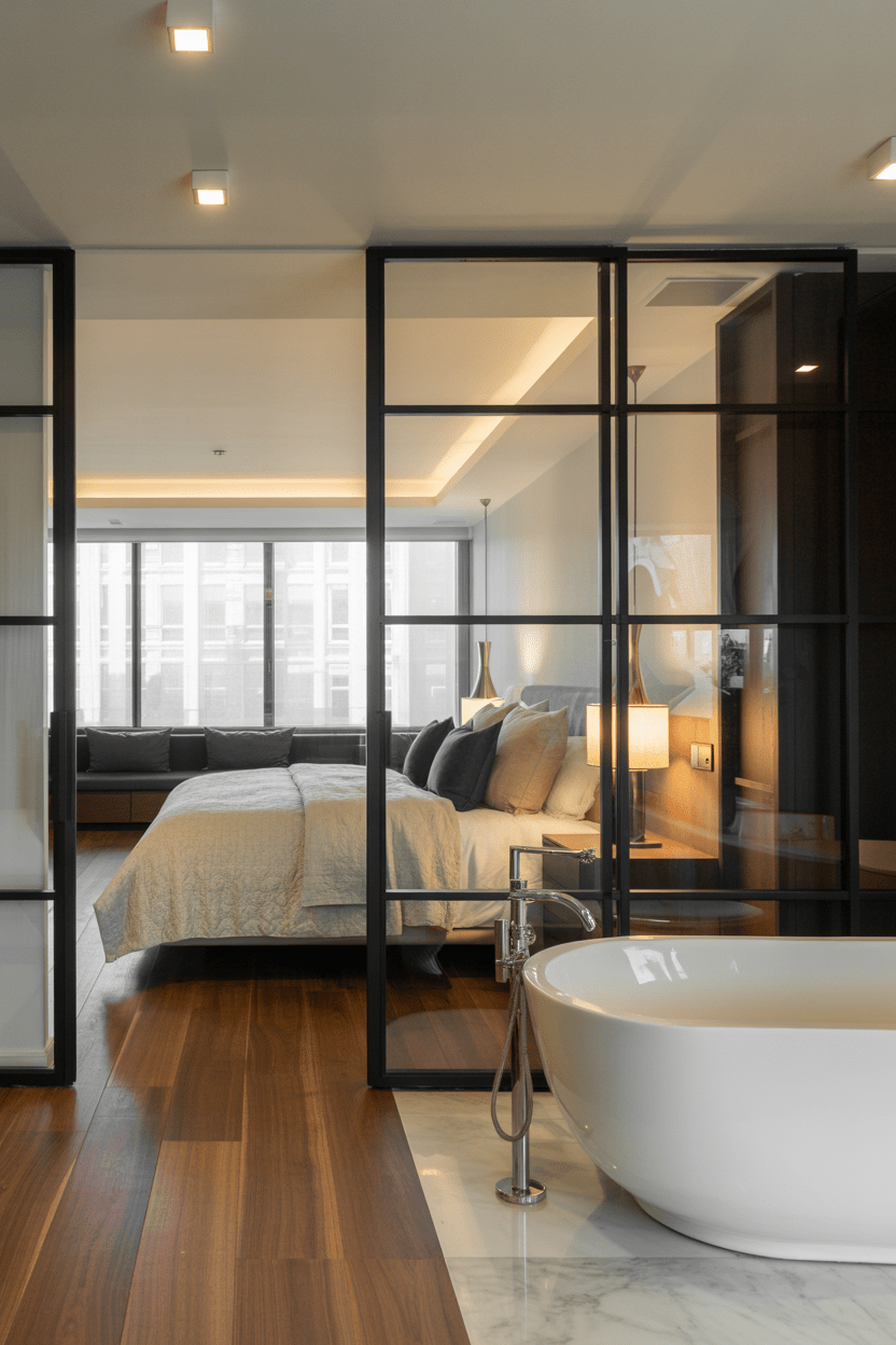 Keep open plan master bedrooms and en suite bathroom layouts light and architectural. A black-framed glass partition adds just enough separation while keeping the space open and connected. This is such a beautiful way to blend privacy with that airy open-plan aesthetic.