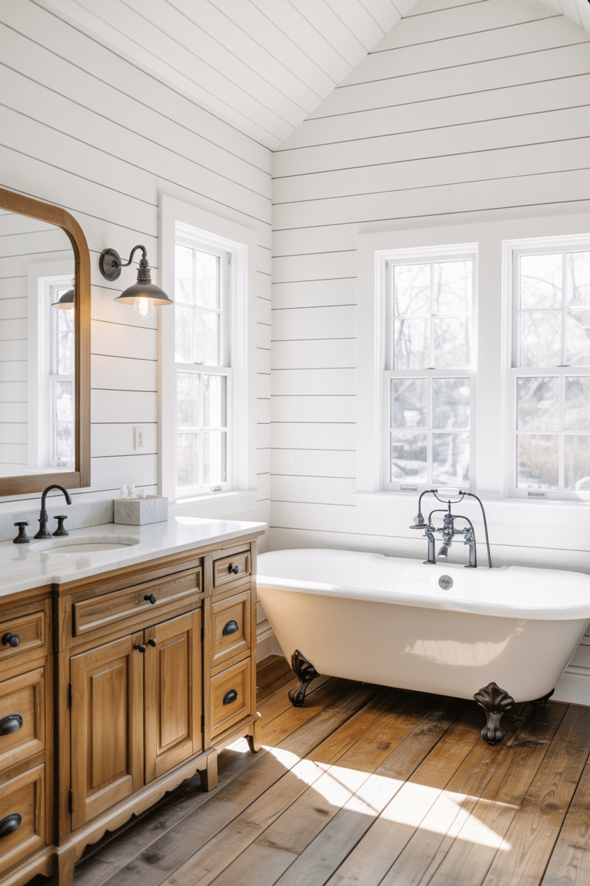 En suite farmhouse bathroom spaces are always cozy and welcoming in the best way. Shiplap walls, warm wood vanities, and vintage-style lighting create that inviting charm so many of us love. Pair those elements with classic white tile to keep it fresh and timeless.