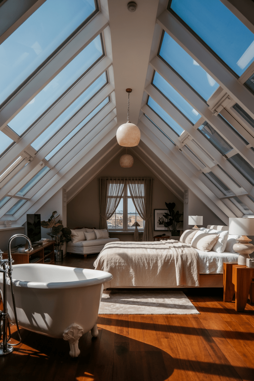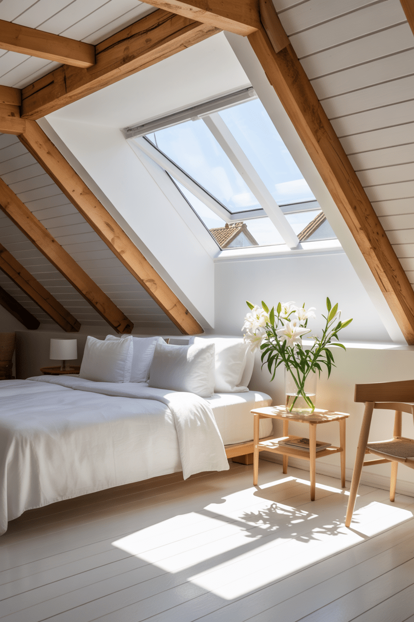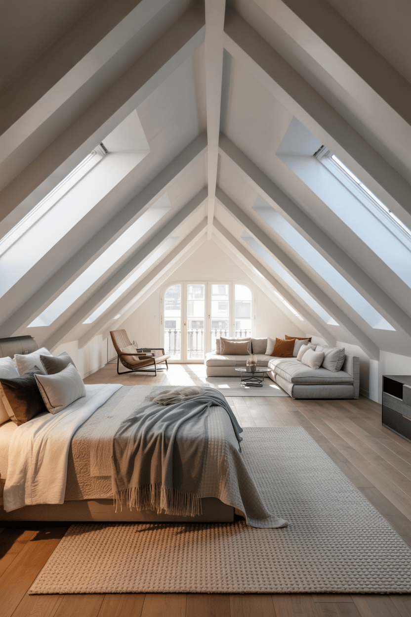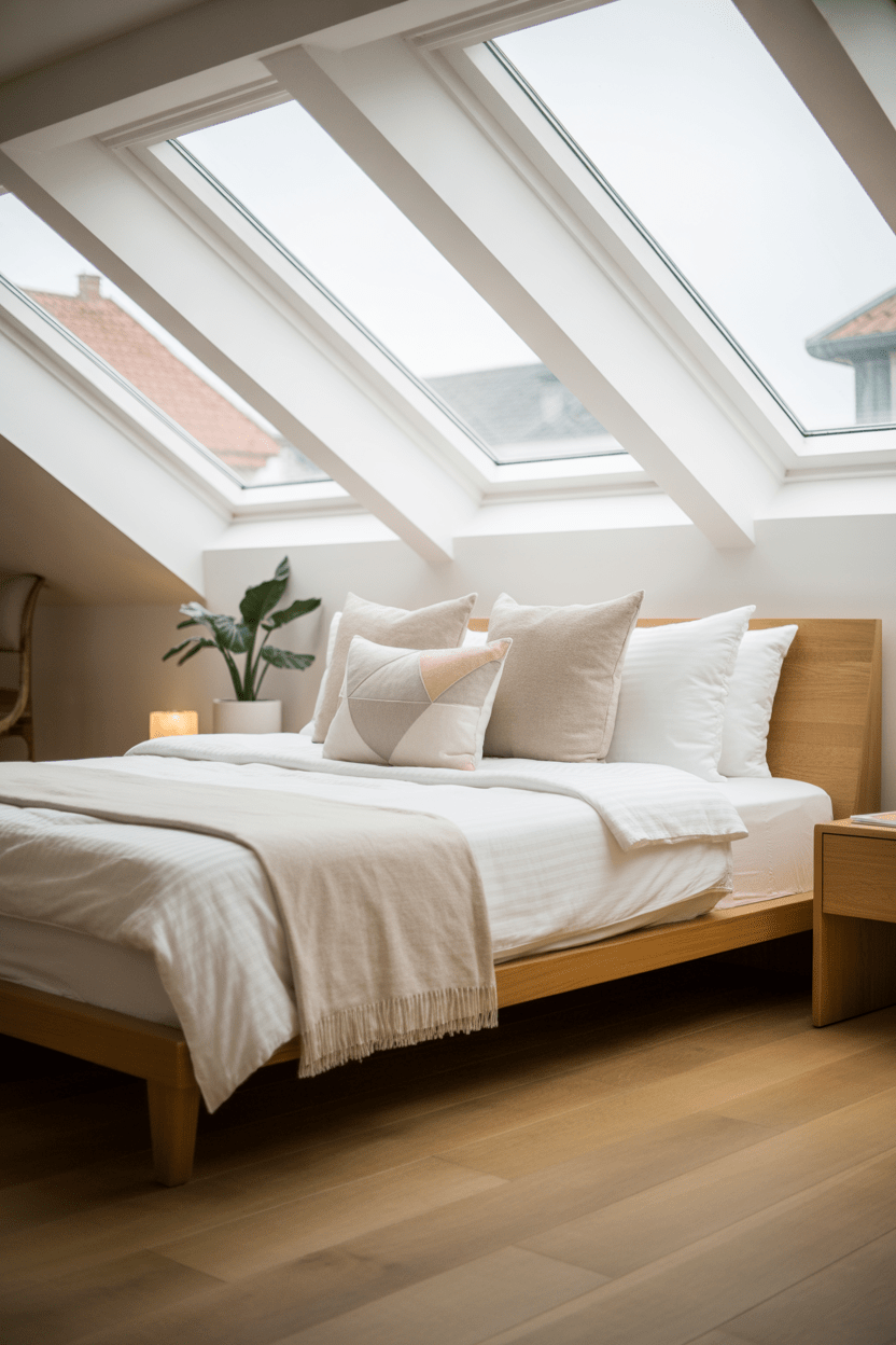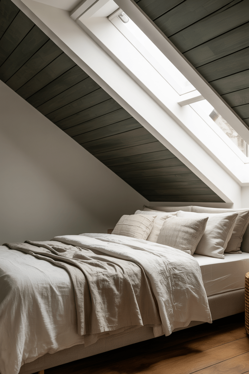 If you love clean lines like I do, modern attic bedroom ideas with sloped ceilings are such a beautiful direction to go. Think low-profile platform beds, streamlined nightstands, and layered lighting that keeps everything bright and airy. Skylights are especially magical because they flood the room with natural light and visually open up low ceilings. Keeping the palette neutral helps the architecture shine while still feeling warm and inviting.