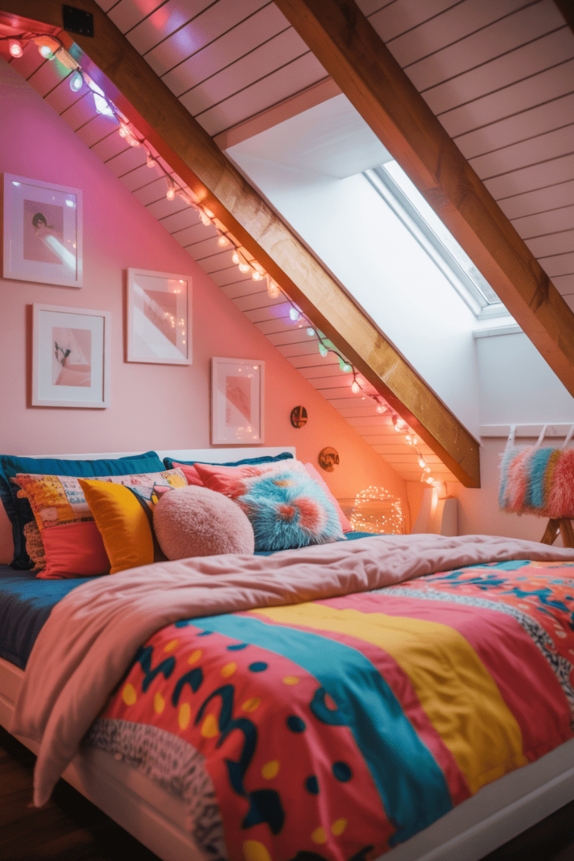 11. Pink or colorful attic bedroom for teens