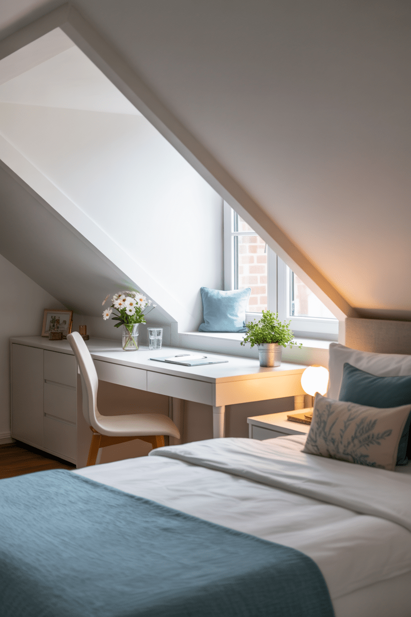 Attic bedroom and home office ideas are perfect if you need multifunctional space. I love placing a compact desk beneath slanted walls where ceiling height is lower. It maximizes usability without interfering with the sleeping area. Thoughtful attic bedroom furniture ideas help the room feel balanced instead of divided.