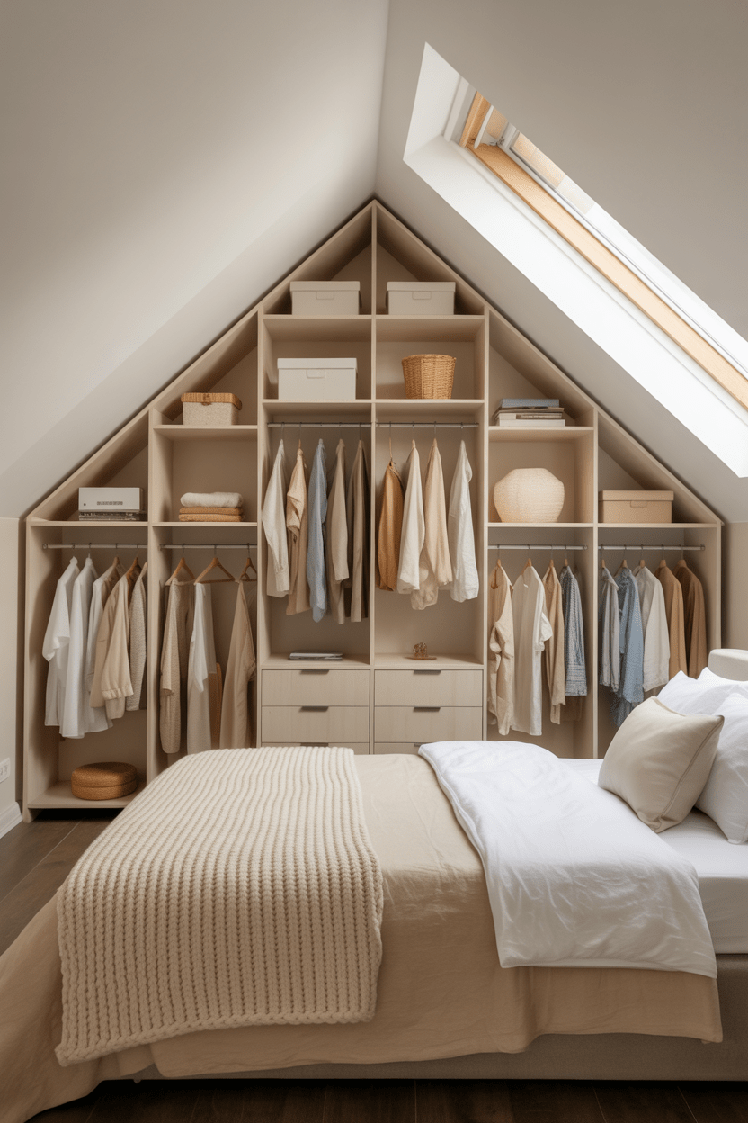 Attic bedroom walk-in closet ideas can completely change how functional the space feels. Converting low sections into custom wardrobe areas or closet ideas for attic bedroom storage keeps clutter hidden. This approach is especially helpful in attic bedrooms with angled ceilings and slanted walls.