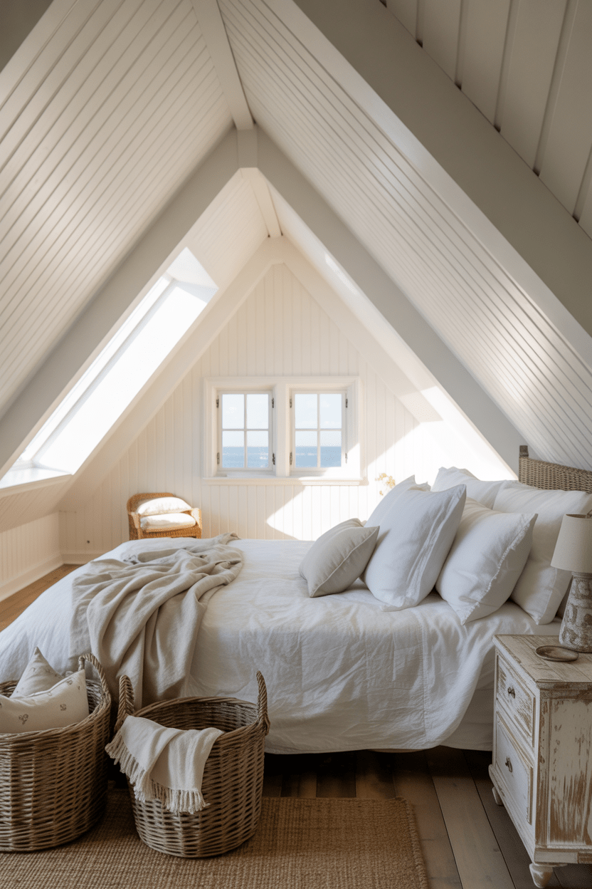 5. Cozy cottage attic bedroom with whitewashed beams