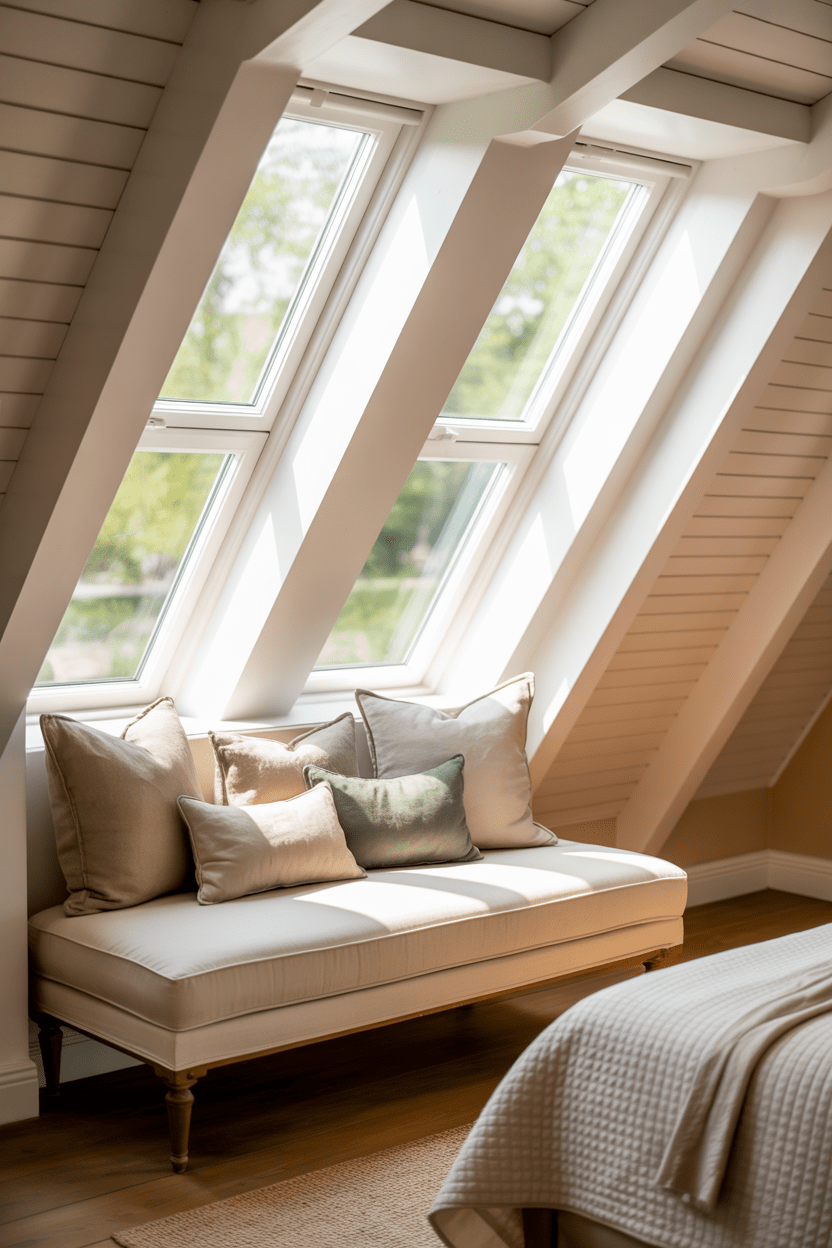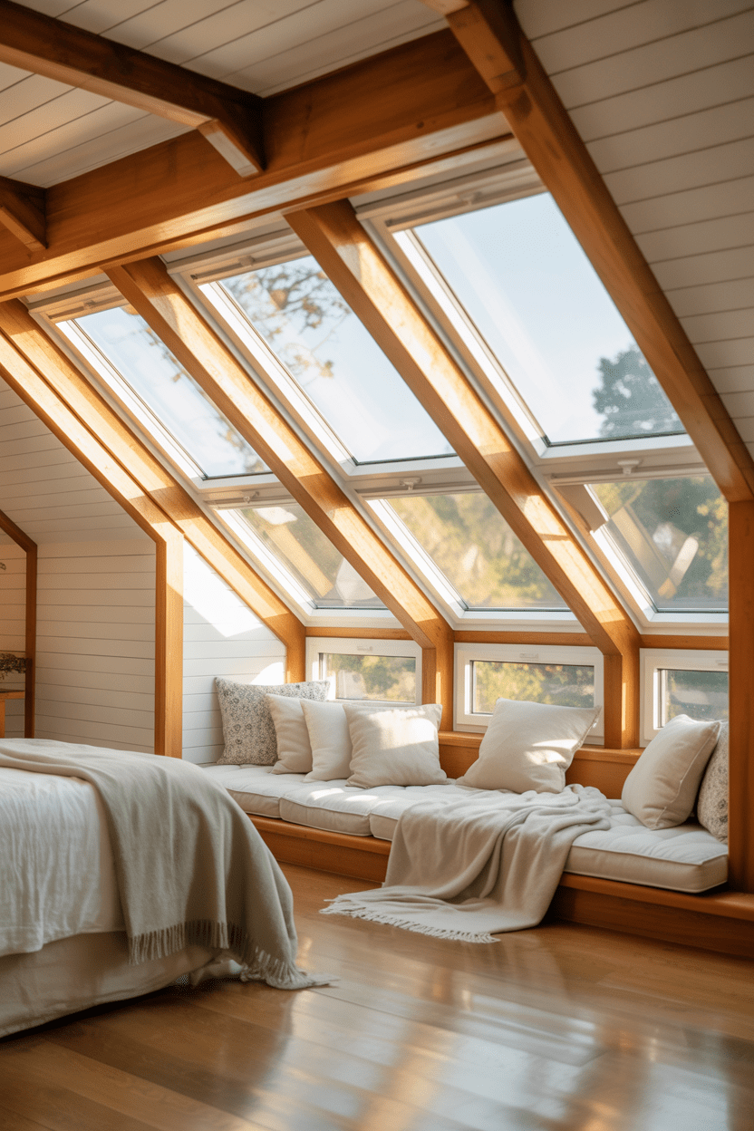 Attic bedroom windows can completely transform the mood of the space. Adding skylights brings in so much natural light, especially in low ceiling rooms. I also love creating a window seat under a dormer for a reading nook. It turns unused space into something charming and functional while making the entire attic bedroom feel brighter and more welcoming.