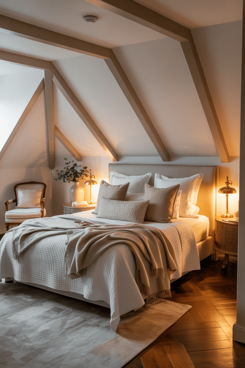 Attic bedroom lighting makes such a huge difference in my opinion. Installing warm LED lighting along beams or under sloped ceilings highlights the architecture and creates ambiance. In attic bedrooms with angled ceilings, soft lighting enhances those cozy spaces and that snug retreat feeling.
