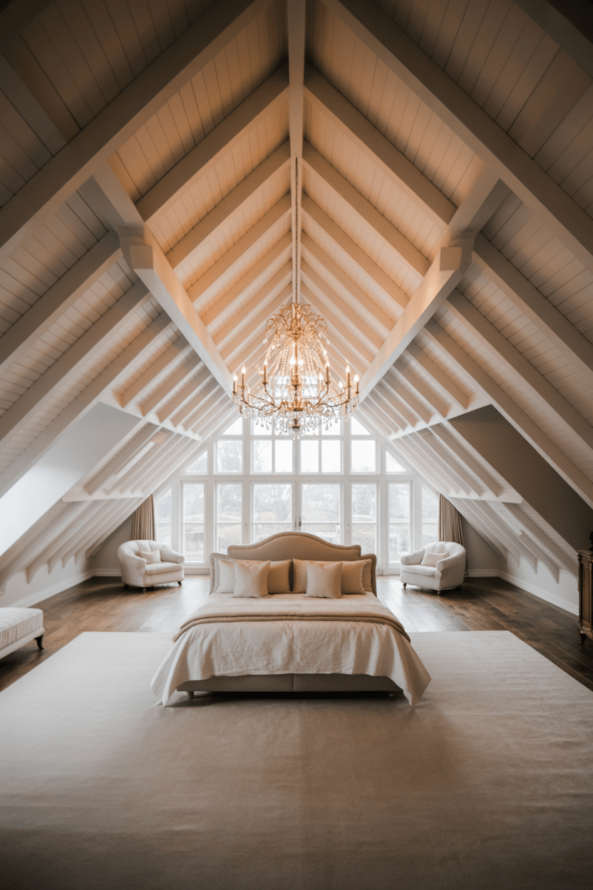 Large attic bedroom ideas deserve a focal point. In big attic bedroom ideas, I love centering a dramatic chandelier where ceiling height peaks. It draws the eye upward and anchors the entire layout. Plus, it’s so darned dramatic, darling.