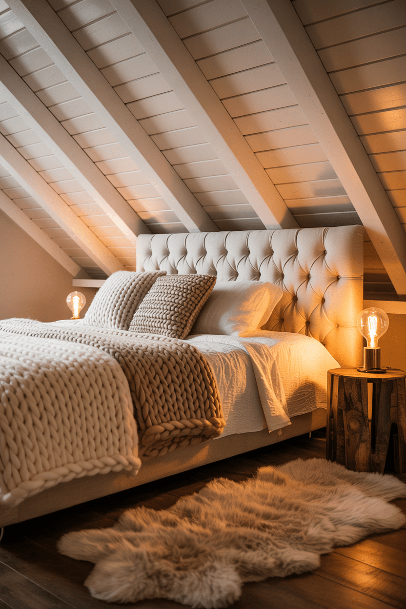 Cozy attic bedroom spaces thrive on texture. Chunky knit throws, upholstered headboards, plush rugs, and soft lighting make small attic bedrooms with low ceilings feel intentional and inviting. When you embrace the snug proportions instead of fighting them, the space becomes incredibly charming.