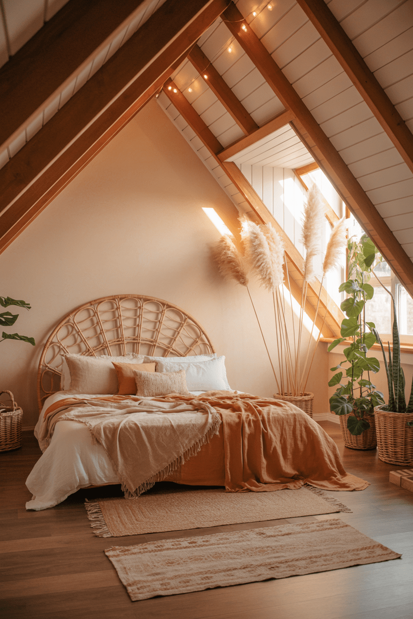 Boho attic bedroom ideas are made for cozy attic spaces. I love layering textured rugs, rattan furniture, soft linen bedding, and warm string lights along angled ceilings. The relaxed, collected look works beautifully in attic bedroom ideas aesthetic cozy designs because slanted walls naturally create intimate nooks. Add plants near attic bedroom window ideas and incorporate earthy tones for that effortless vibe.
