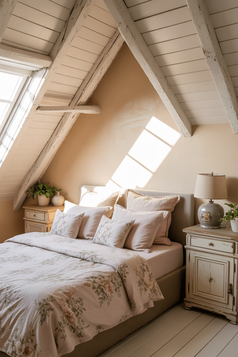 Cottage attic bedroom ideas will always have my heart. Exposed beams, whitewashed wood, floral bedding, and vintage-inspired decor feel perfectly at home under angled ceilings. For low attic bedroom angled ceilings, painting the beams a soft white keeps the space feeling open while still adding charm. This style works especially well in small attic bedrooms with low ceilings because the light color palette reflects natural light and makes everything feel airy.