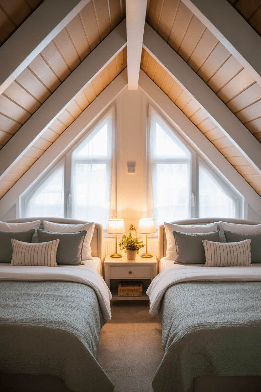 Attic bedroom ideas with two-bed layouts work beautifully for siblings or guests. Positioning twin beds under opposite slopes creates balance and symmetry in attic shared bedroom ideas. Keeping decor cohesive and using built-in storage between beds makes even a small attic bedroom feel thoughtfully designed instead of crowded.