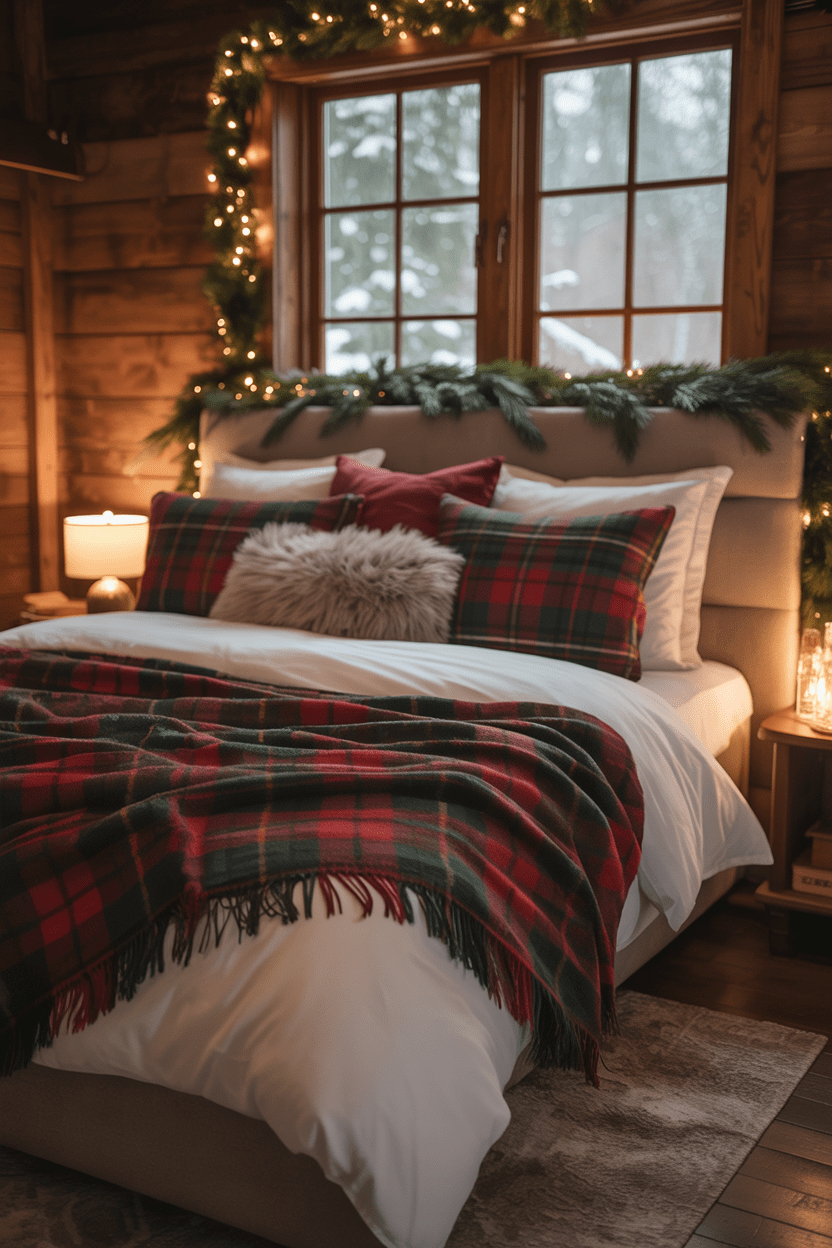 If you’re dreaming of a snowy mountain retreat, bring the cozy cabin vibes into your bedroom. Plaid blankets, wooden furniture, and natural accents create a cabin-inspired Christmas bedroom that feels warm, snug, and perfect for curling up with a mug of cocoa.