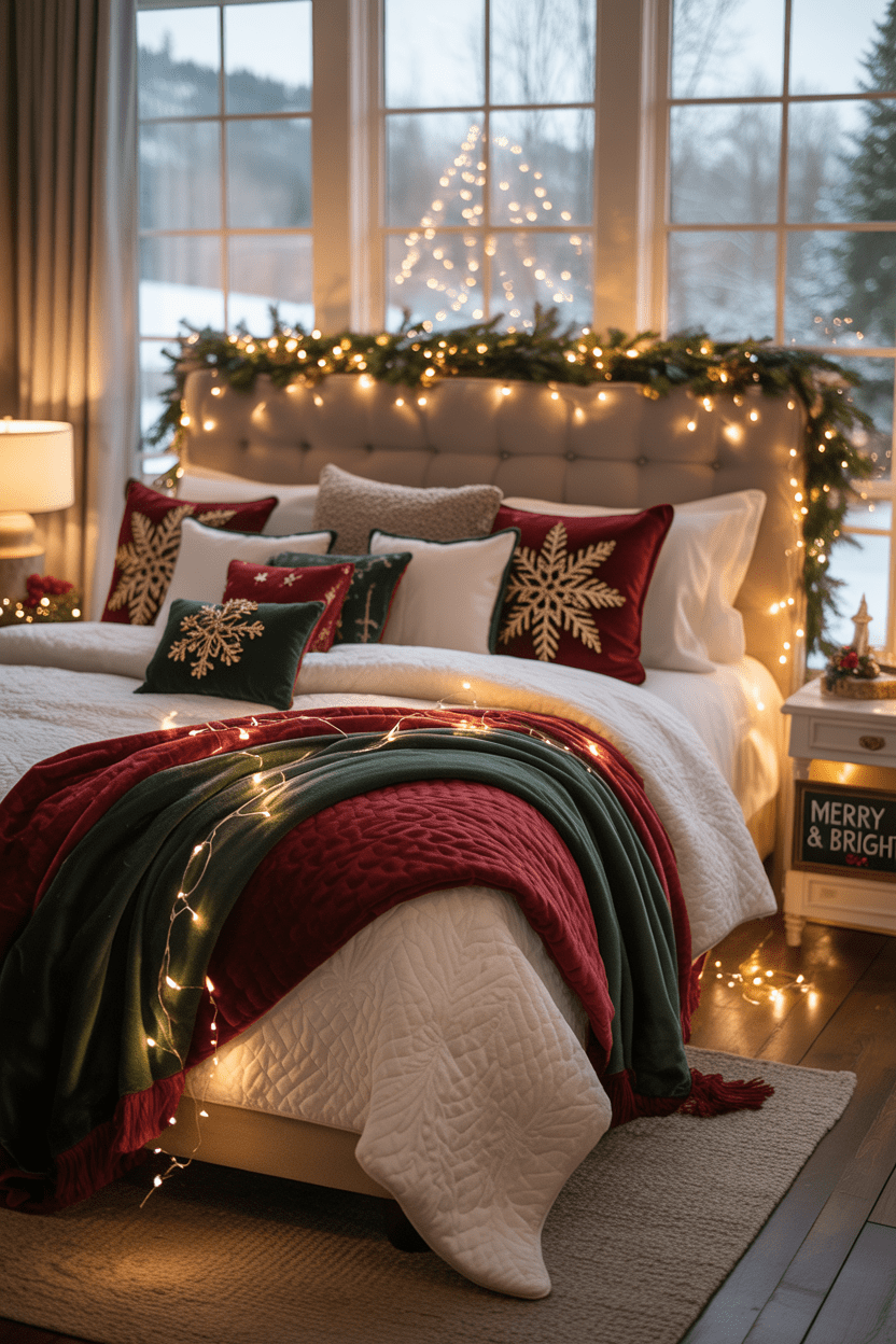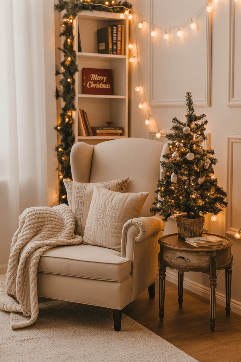 Finally, create little cozy corners in your bedroom—perfect for reading, relaxing, or just soaking in the holiday vibe. Twinkling lights, festive pillows, and a small tree in the corner can make even the smallest bedroom feel magical and inviting.