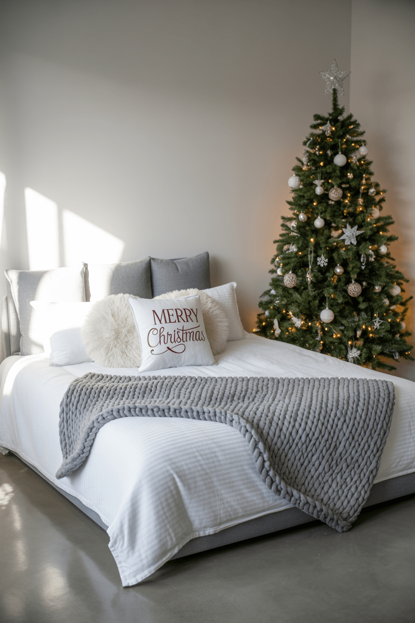 If you prefer clean lines and subtle decor, a modern minimalist Christmas bedroom is perfect. Think neutral tones, simple ornaments, and elegant lighting for a chic holiday look that feels serene and stylish.