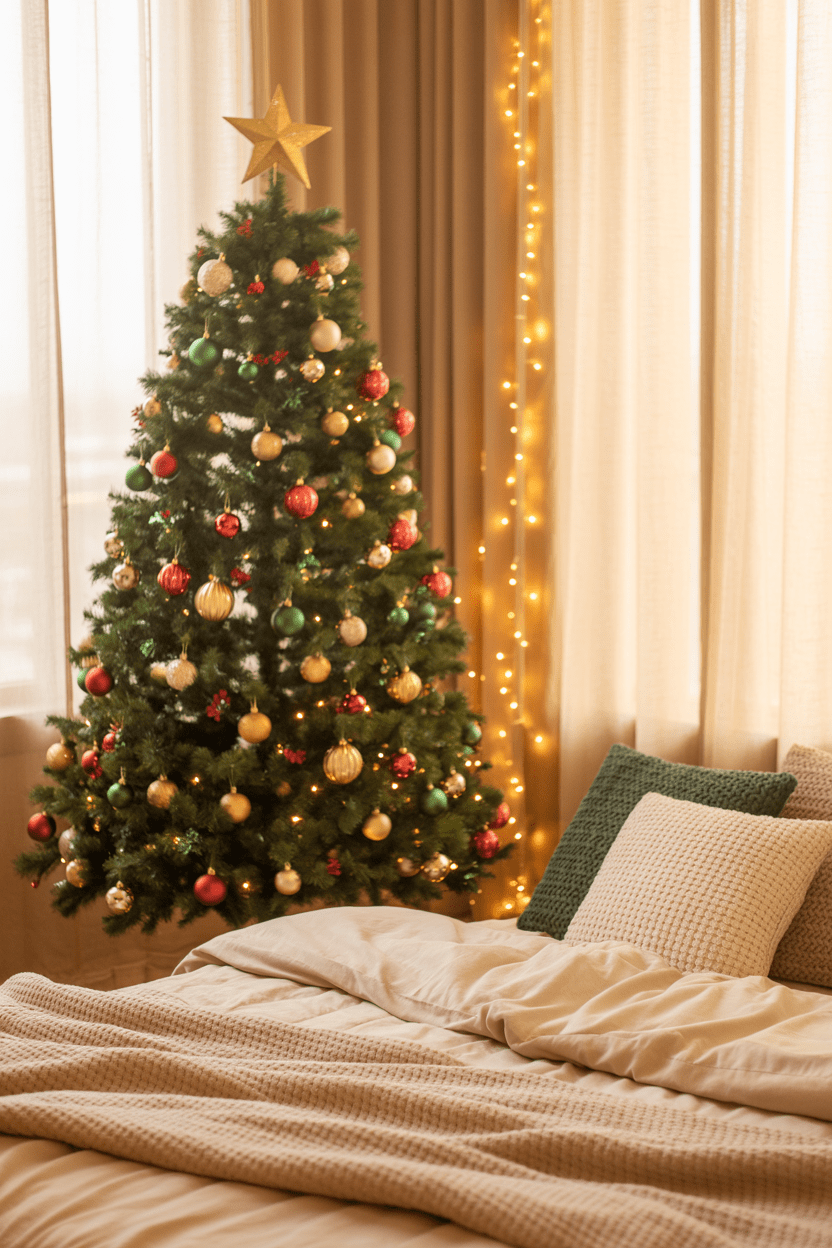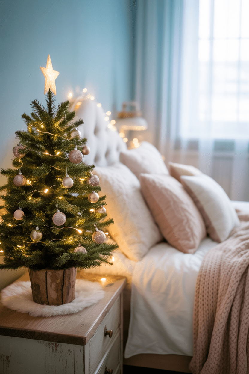 Even tiny bedrooms deserve holiday cheer. A mini Christmas tree on a nightstand or dresser brings festive charm without taking up space. Add fairy lights and tiny ornaments, and suddenly your small bedroom Christmas decor feels thoughtful and magical.