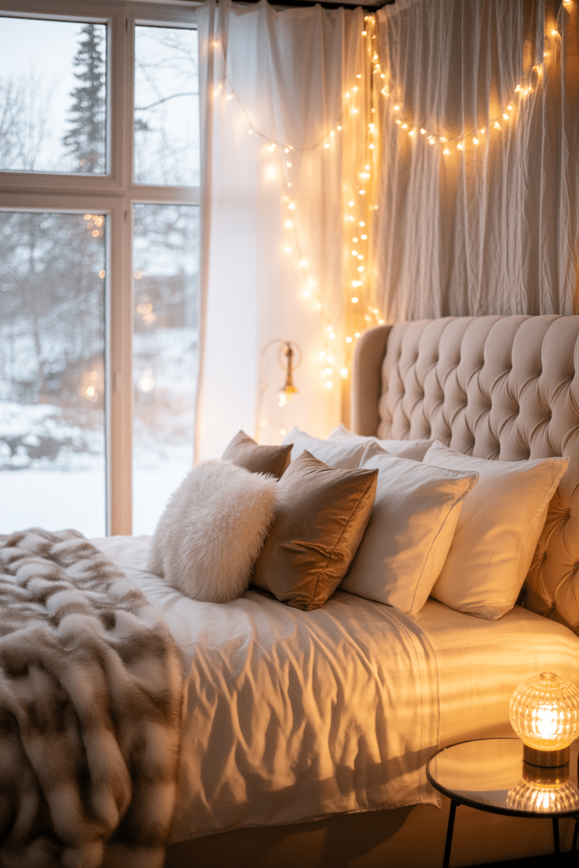 I love the idea of turning your bedroom into a mini winter wonderland. Think soft throws, fluffy pillows, and twinkling lights draped across your bed or shelves. Adding faux snow accents, neutral tones, and a few metallic touches gives your cozy Christmas bedroom aesthetic that serene, magical feel we all crave during the holidays.